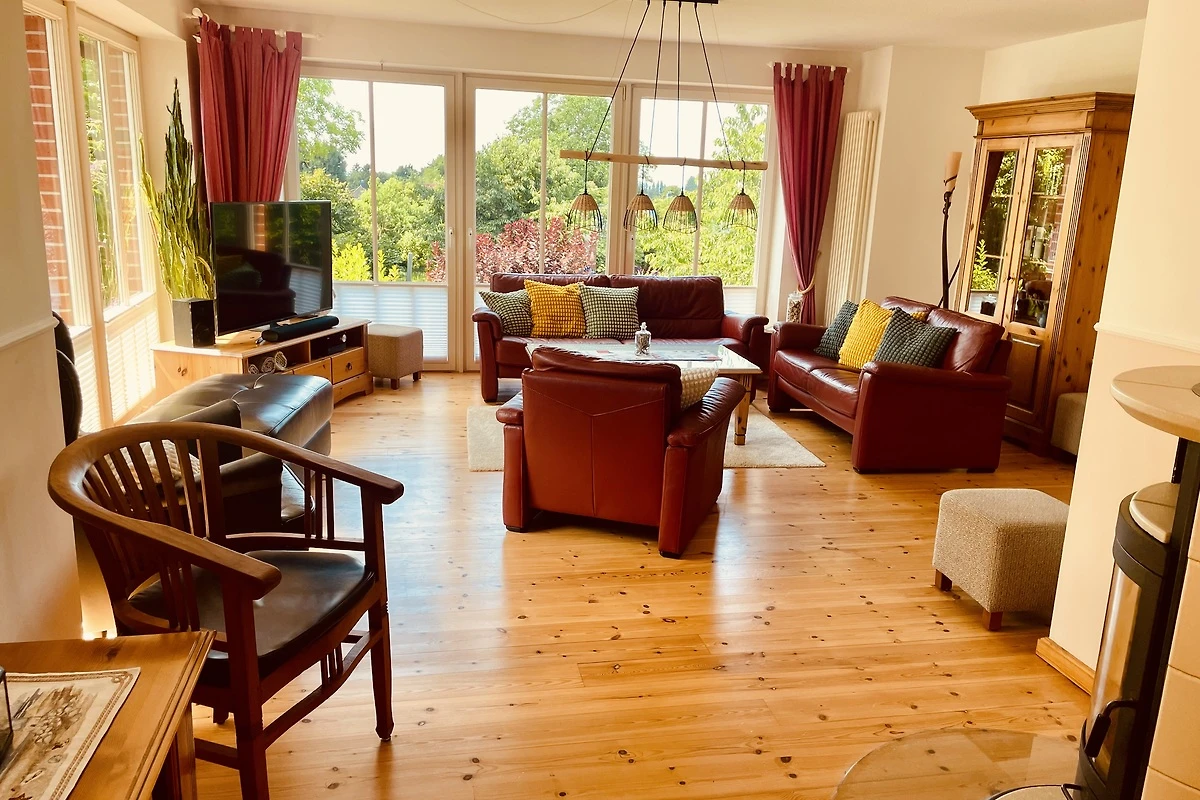 Finestre sulla terrazza con vista sul Grande Jasmund Bodden. La cucina è dotata di lavastoviglie super-silenziosa, forno a microonde, tostapane, bollitore, frigorifero, doppia macchina per il caffè, congelatore separato, cucina moderna con forno, molto spazio e superficie di lavoro, ecc. .... L'adiacente zona giorno, luminosa e inondata di luce, con finestre a tutta altezza, offre una splendida vista su Bodden, sul giardino e sui campi adiacenti. Vi sono inoltre ampi spazi, comodi posti a sedere, Smart TV 4K da 55 pollici, stufa a legna, ....... Su questo piano si trova anche un bagno completo con doccia e WC e una camera da letto principale di circa 15 m² con letto matrimoniale da 1,80; ampio disimpegno con armadio separato.