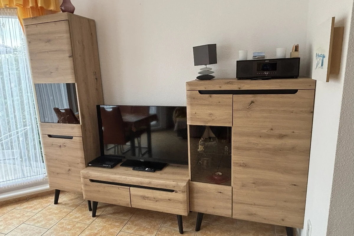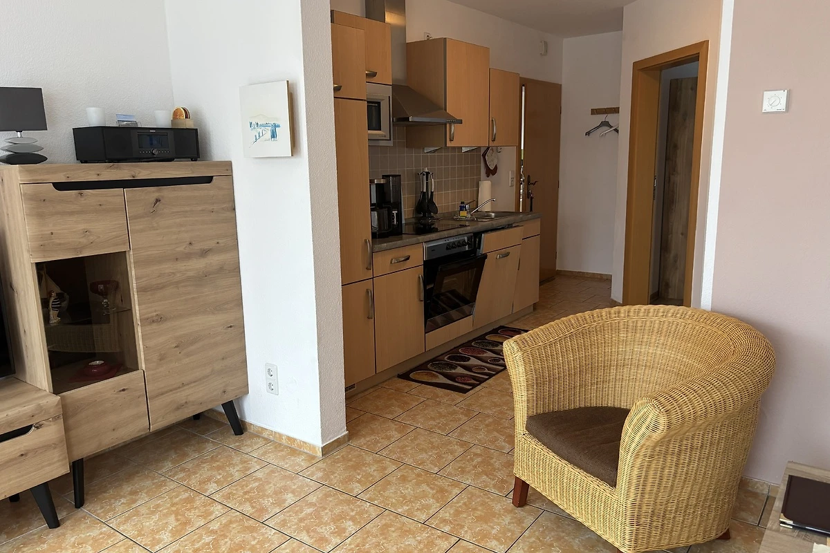 L'appartamento per le vacanze si trova al piano terra della nostra casa vacanze con un totale di 4 appartamenti. Per una vacanza confortevole e rilassante, ci sono un soggiorno, una cucina attrezzata, una camera da letto e una terrazza con mobili da salotto. La cucina è attrezzata in modo funzionale con tostapane, macchina per il caffè, frigorifero-congelatore, microonde, piano cottura in vetroceramica e lavastoviglie. Grazie all'ampia finestra frontale del soggiorno, questa stanza è sempre inondata di luce e invita al relax. C'è un letto matrimoniale nella camera da letto e un divano letto nel soggiorno per un sonno riposante. Nelle giornate più fresche, il riscaldamento parziale a pavimento del soggiorno offre un piacevole calore. Naturalmente saremo lieti di fornirvi anche una culla e un seggiolone. La spiaggia di sabbia fine è facilmente raggiungibile a piedi dopo circa 600 metri. Tutte le necessità quotidiane sono disponibili nel centro città (distanza circa 300 m).