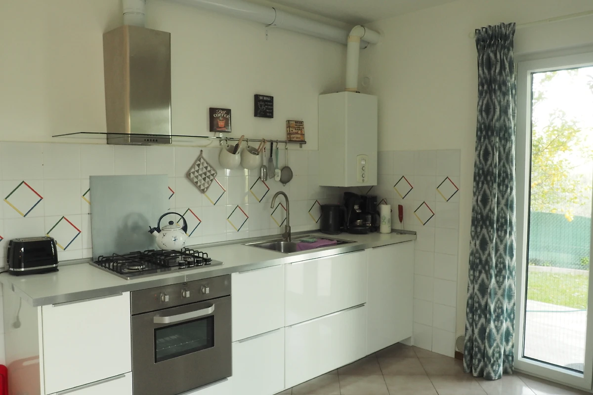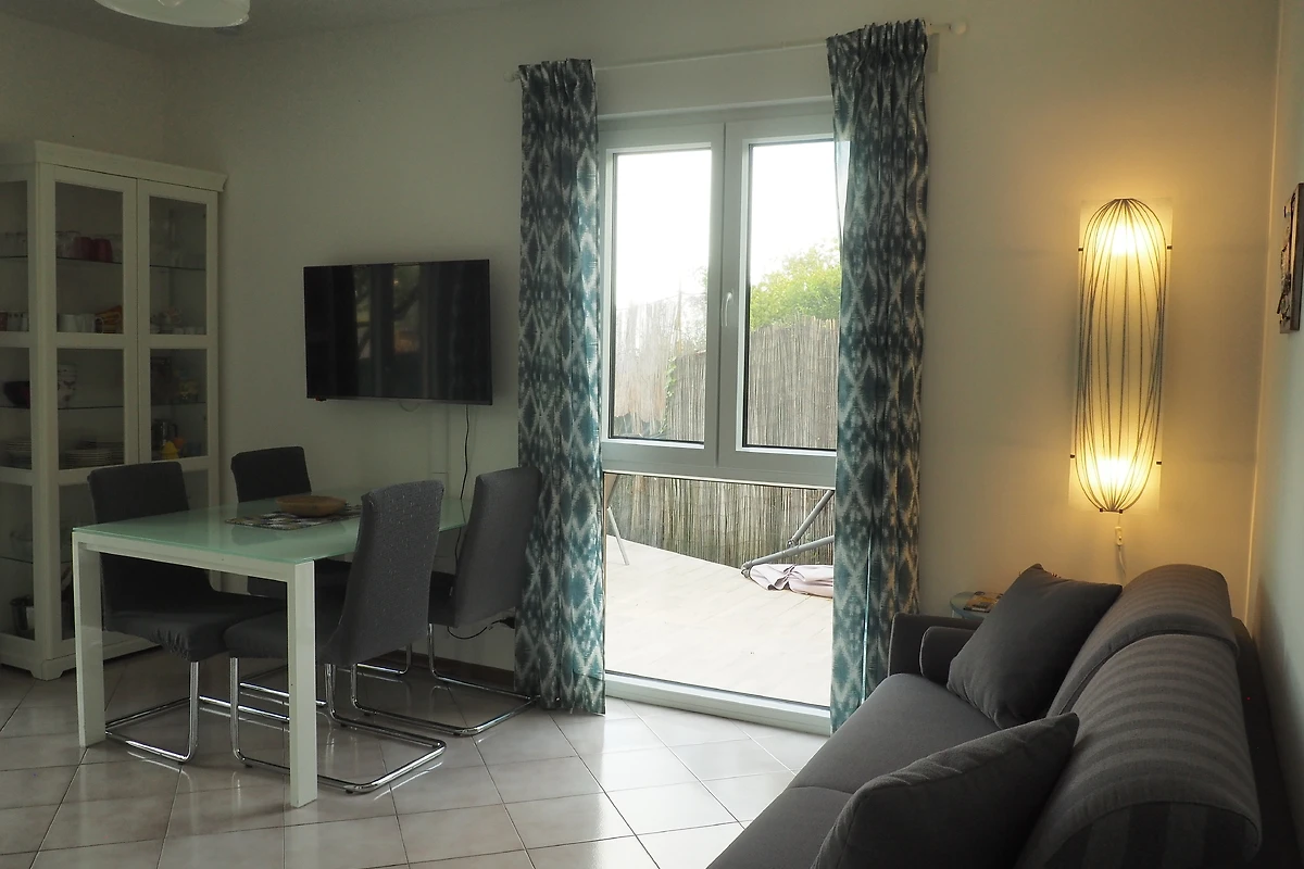 La luminosa cucina - soggiorno è dotata di un piccolo angolo cottura (con lavastoviglie), e un tavolo da pranzo rotondo un comodo divano letto matrimoniale e TV e ha due porte finestre nel giardino o sulla terrazza. Sulla terrazza e nel giardino si può godere la vista mentre grigliate e mangiate, così come il relax!