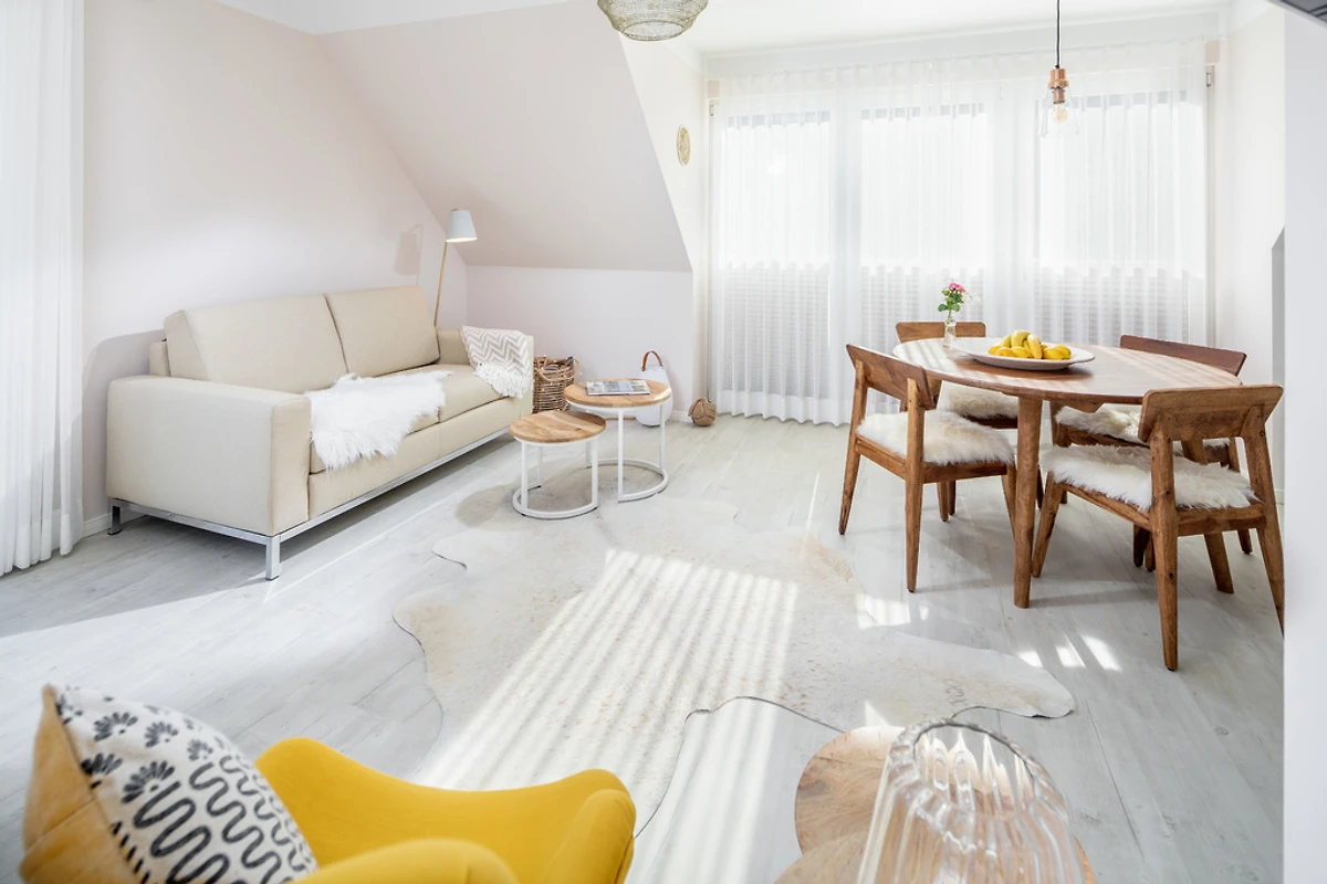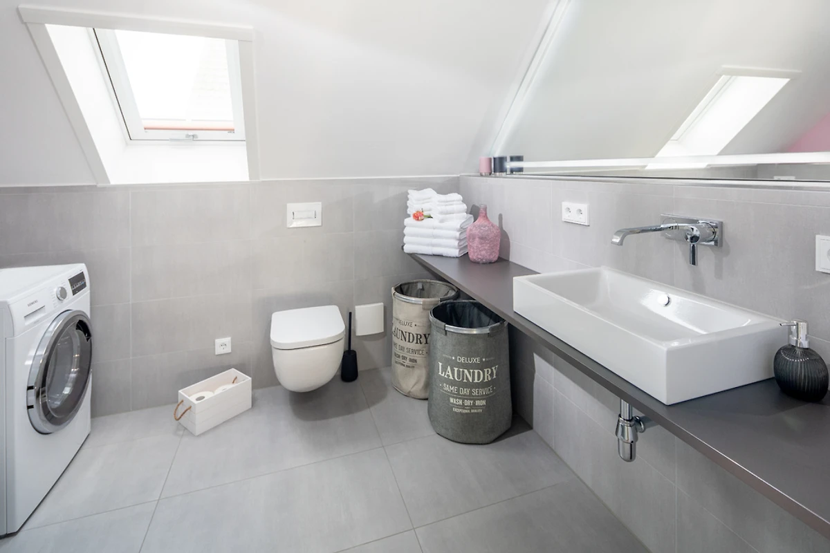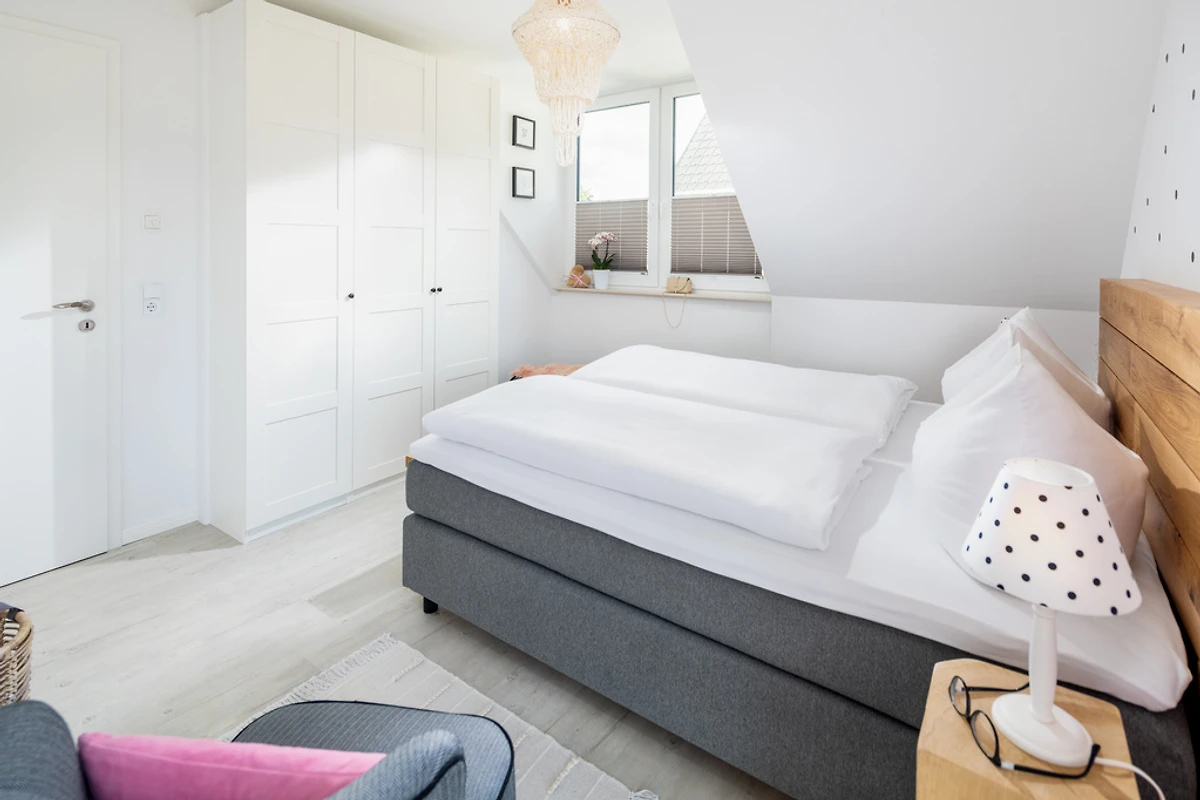 L'appartamento di 55 m2 all'ultimo piano è dotato di due camere. I ritardatari potranno godere appieno del lussuoso letto a molle insacchettate della camera da letto. Nel soggiorno e nella zona pranzo c'è un divano estraibile, per cui l'appartamento è ben abitabile anche da tre persone. La moderna cucina è completamente attrezzata. Nel bagno con luce naturale si trovano una doccia a pavimento, un WC, un lavabo, un apparecchio combinato (lavatrice/asciugatrice), un asciugacapelli e molto spazio per riporre le cose. Dopo le passeggiate tempestose, la sauna a infrarossi offre un luogo per riscaldarsi e rilassarsi. Godetevi la vista panoramica del Norddeich sul balcone già a colazione e siate presenti quando gli ultimi raggi di sole del giorno decorano il cielo della sera.