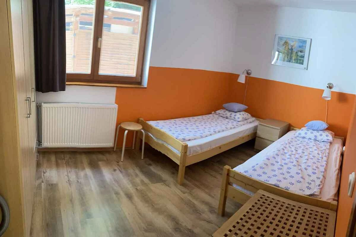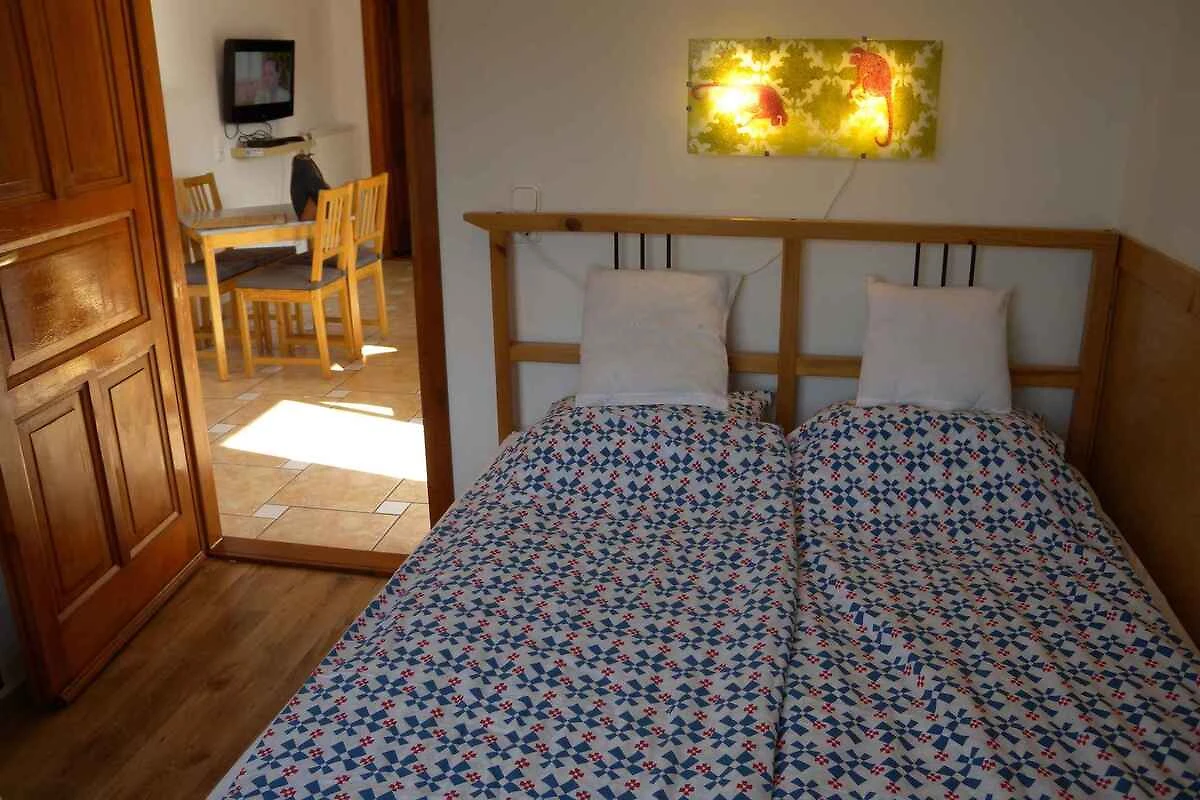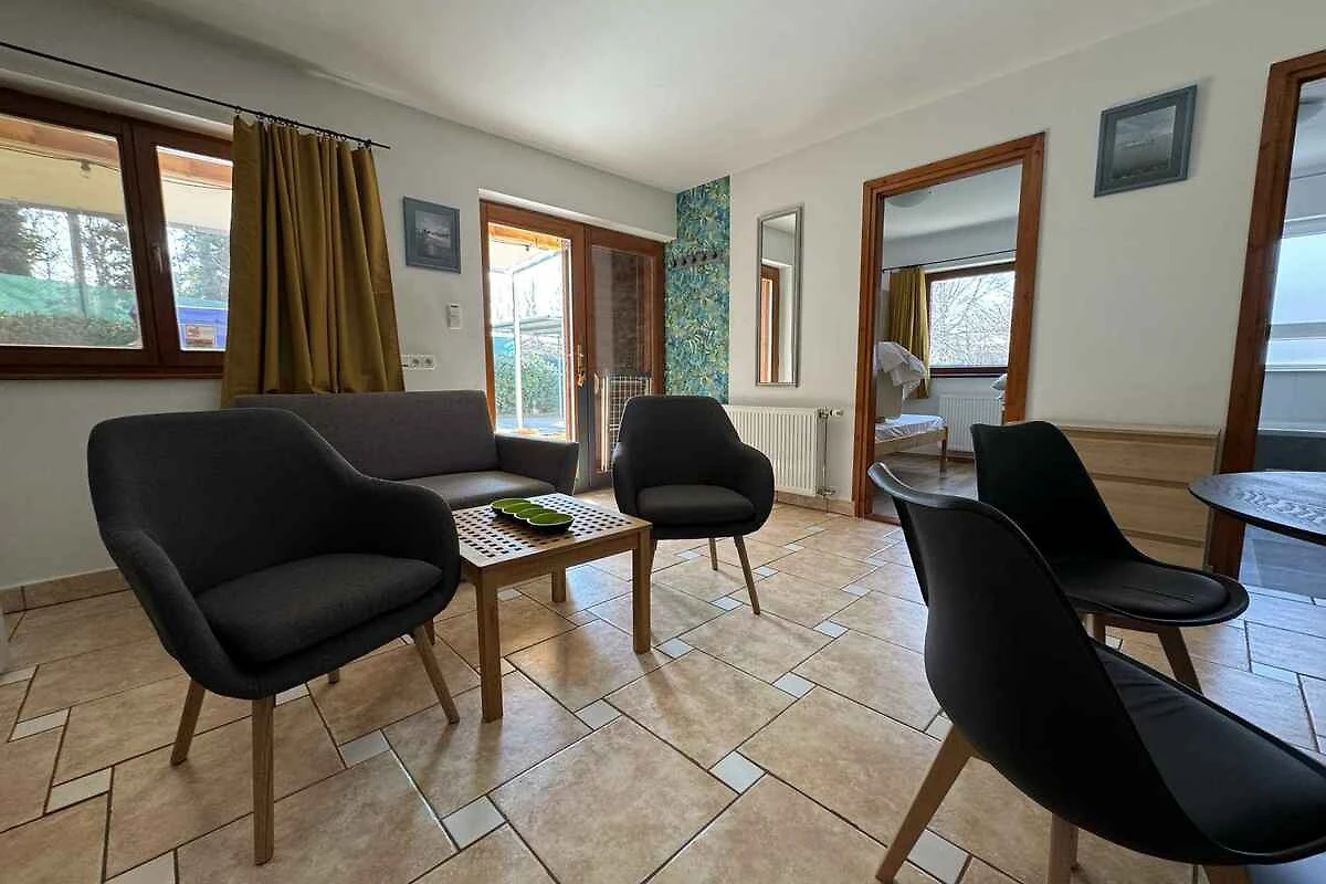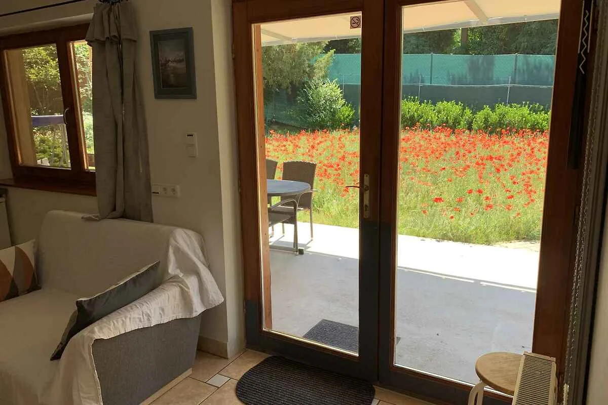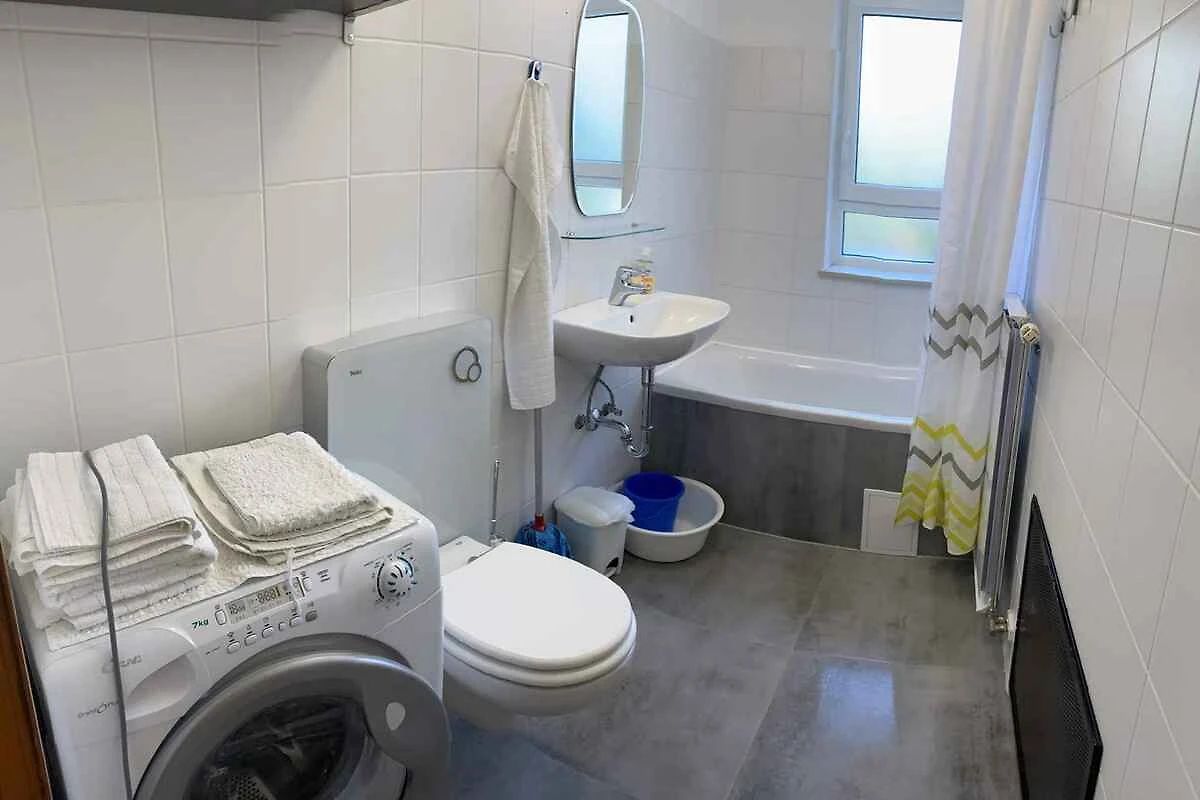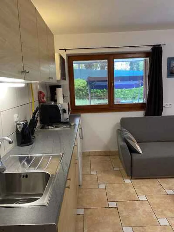 L'ingresso della vostra casa vacanze si trova im Erdgeschoss, é a livello del suolo e conduce sopra la terrazza é 15 mq grande direttamente nel soggiorno/camera da letto. Soggiorno/camera da letto con 2 letti aggiuntivi su divano letto doppio (adatto solo per bambini sotto 11 anni), TV e DVD. Camera da letto con 1 letto matrimoniale. Camera da letto (12 mq) con 2 letti singoli. Angolo cucina in soggiorno/camera da letto con zona pranzo (4 posti), stufa a gas (2 fiamme), frigorifero (120 l, scomparto del ghiaccio), microonde, caffettiera, bollitore elettrico e accesso alla terrazza. Bagno (5 mq) con vasca da bagno con dispositivo doccia, 1 lavandino, WC, asciugacapelli e finestra.