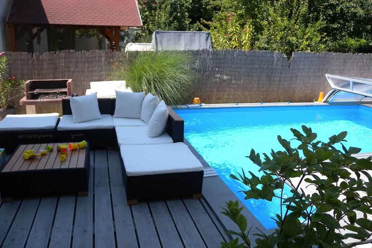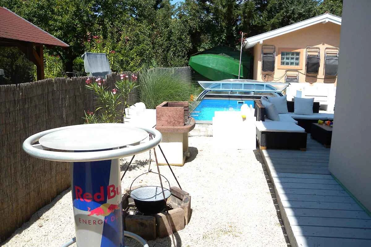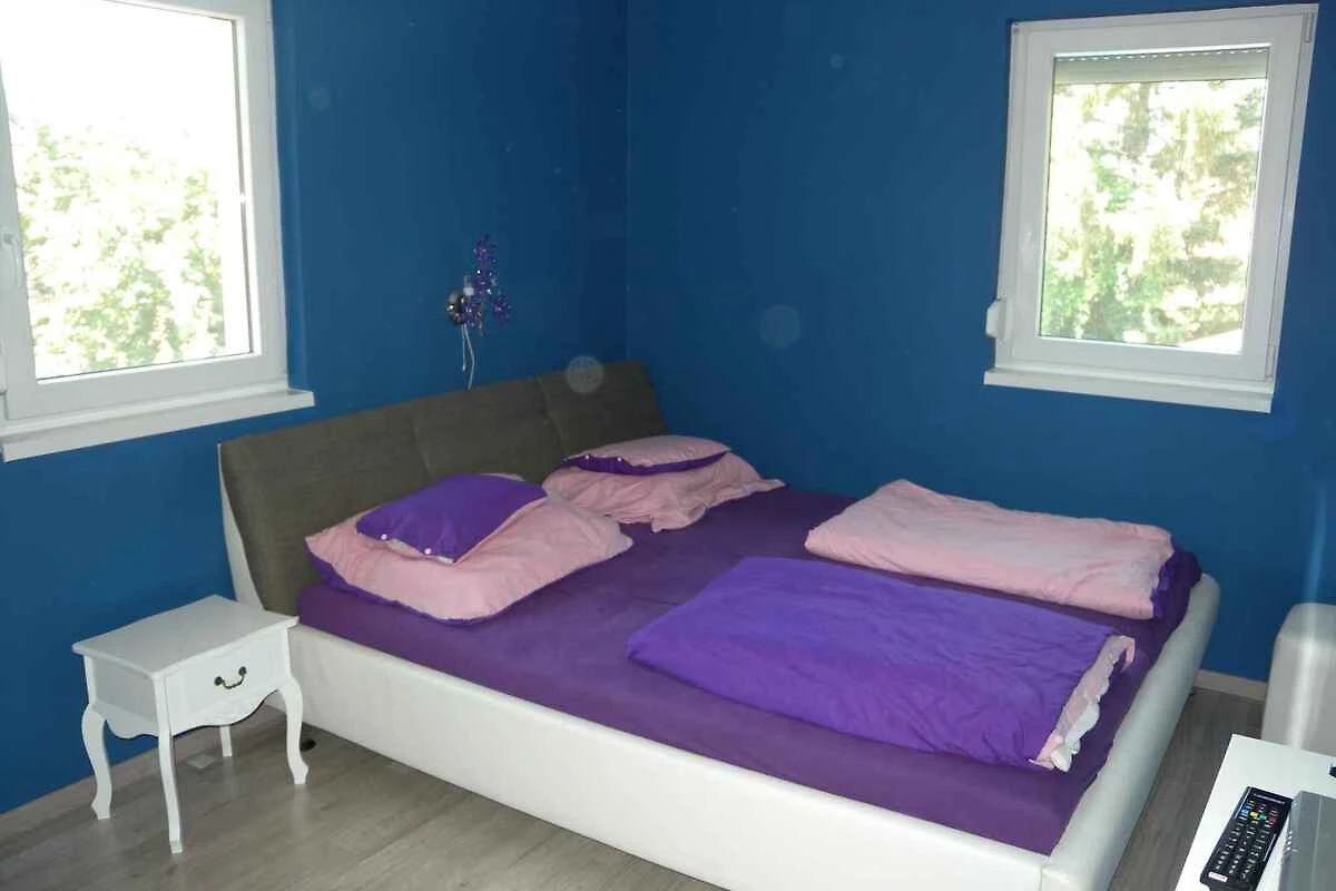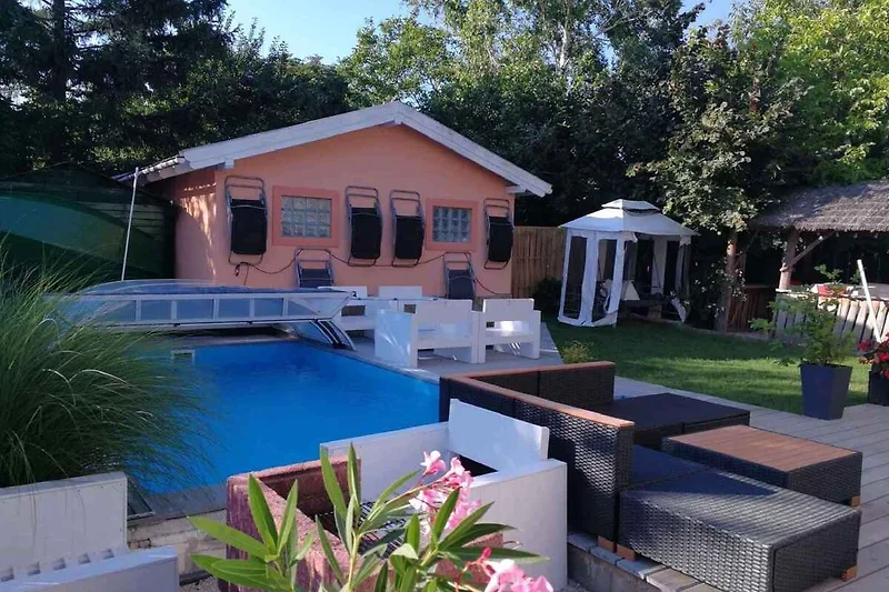 Siofok. L' appartamento vacanze si trova in una trama del giardino chiuso, grande 600 mq con prato, fiori e alberi, delimitata da una recinzione. Il proprietario non abita nella casa o nella proprietá. Nella casa ci sono ancora 3 appartamenti. L'accesso avviene vicino a una strada secondaria (asfaltata). Parcheggio (per 2 auto) sulla strada davanti alla casa.