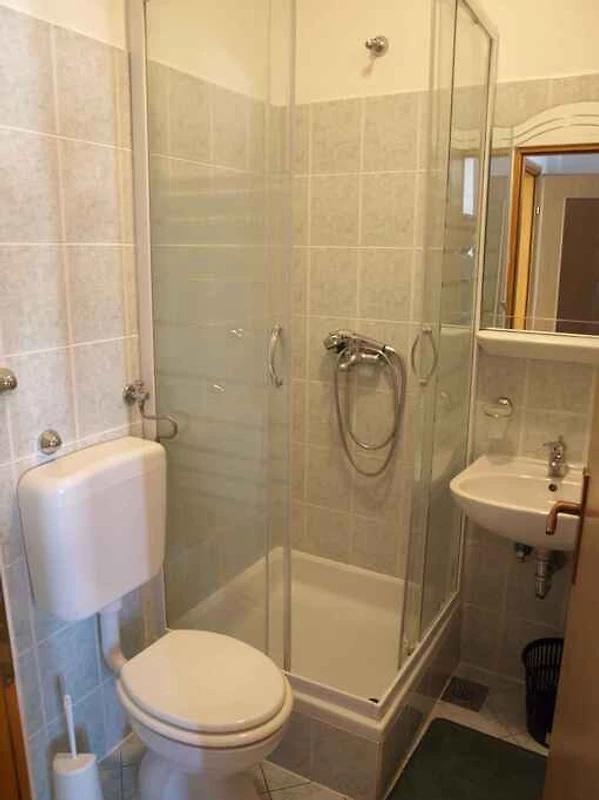 e conduce sopra una scala interna. Soggiorno/camera da letto con 1 letto aggiuntivo su divano/sofa, zona pranzo e accesso al balcone (3 mq, mobili da giardino). Camera da letto con 1 letto matrimoniale. La cucinetta con fornello elettrico (2 fornelli) e frigorifero. Bagno con doccia, 1 lavandino e WC.