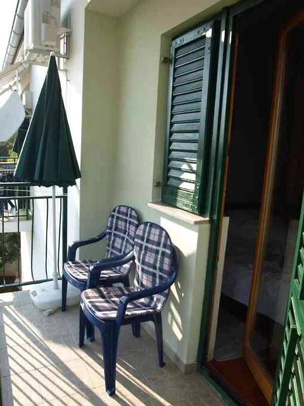 e conduce sopra una scala interna. Soggiorno/camera da letto con 1 letto matrimoniale e accesso al balcone (3 mq, coperto, mobili da giardino). La cucinetta con fornello elettrico (2 fornelli) e frigorifero. Bagno con doccia, 1 lavandino, WC e finestra.
