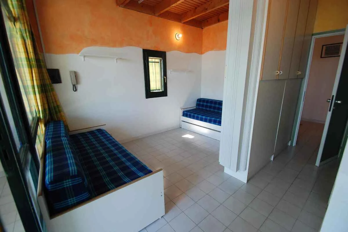 Piano terra: Soggiorno con 2 letti aggiuntivi su divano/sofa, TV, zona pranzo, accesso alla terrazza (mobili da giardino, ombrellone) e il divano letto e il letto a castello sono situati nel soggiorno, leggermente separati dalla cucina. Camera da letto con 1 letto matrimoniale. Angolo cucina nel soggiorno con stufa a gas (4 fiamme), frigorifero, microonde, caffettiera e La macchina del caffè è una caffettiera moka. Un bollitore può essere richiesto alla reception con una cauzione di 20€, che verrà rimborsata al cliente al momento della restituzione del bollitore. Bagno con doccia, 1 lavandino e WC.