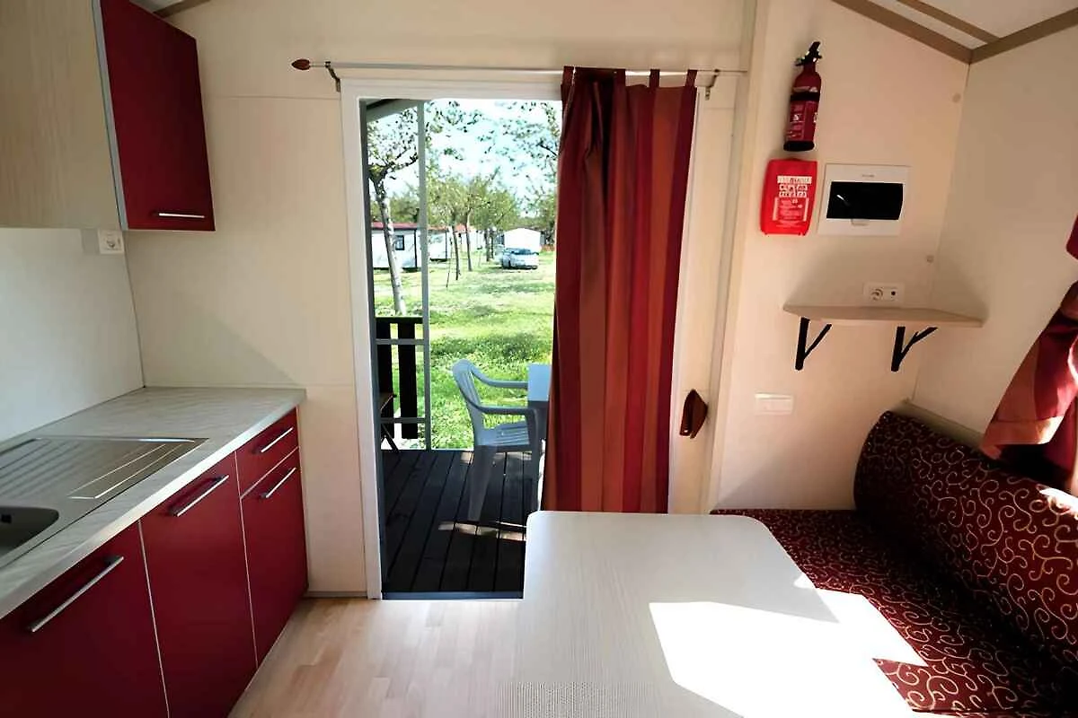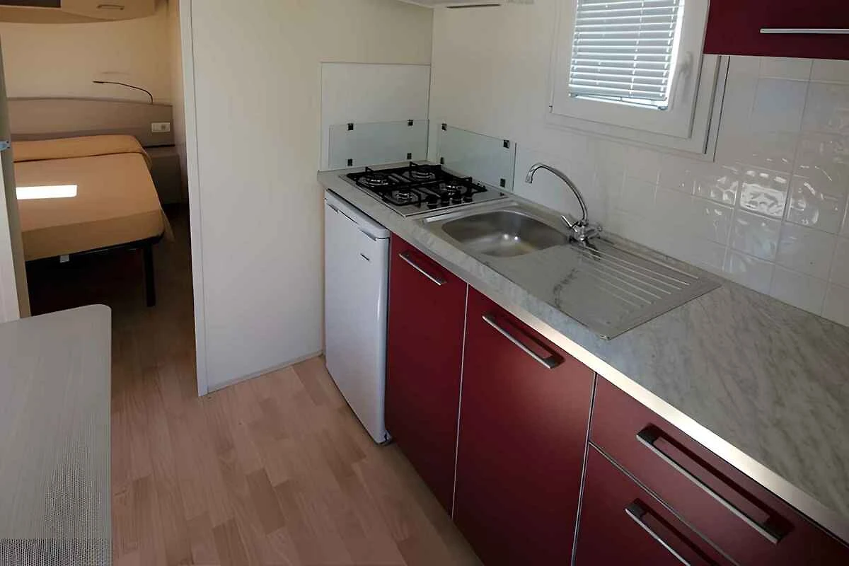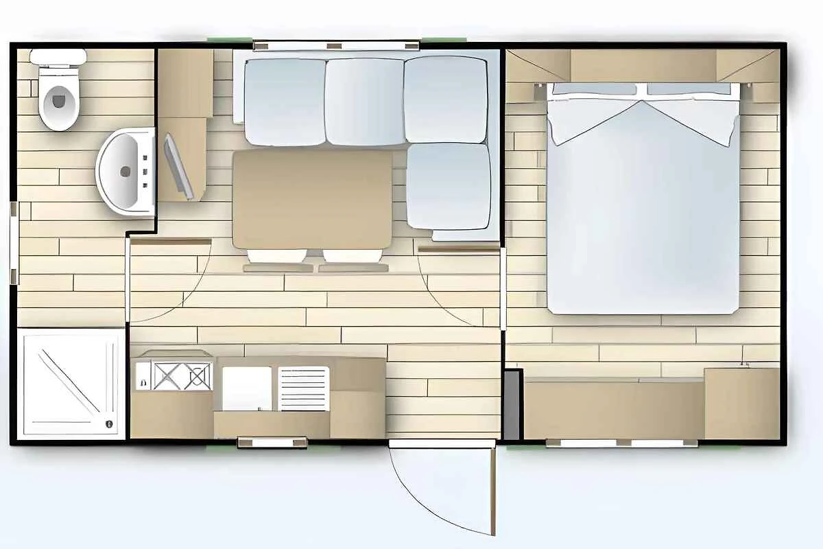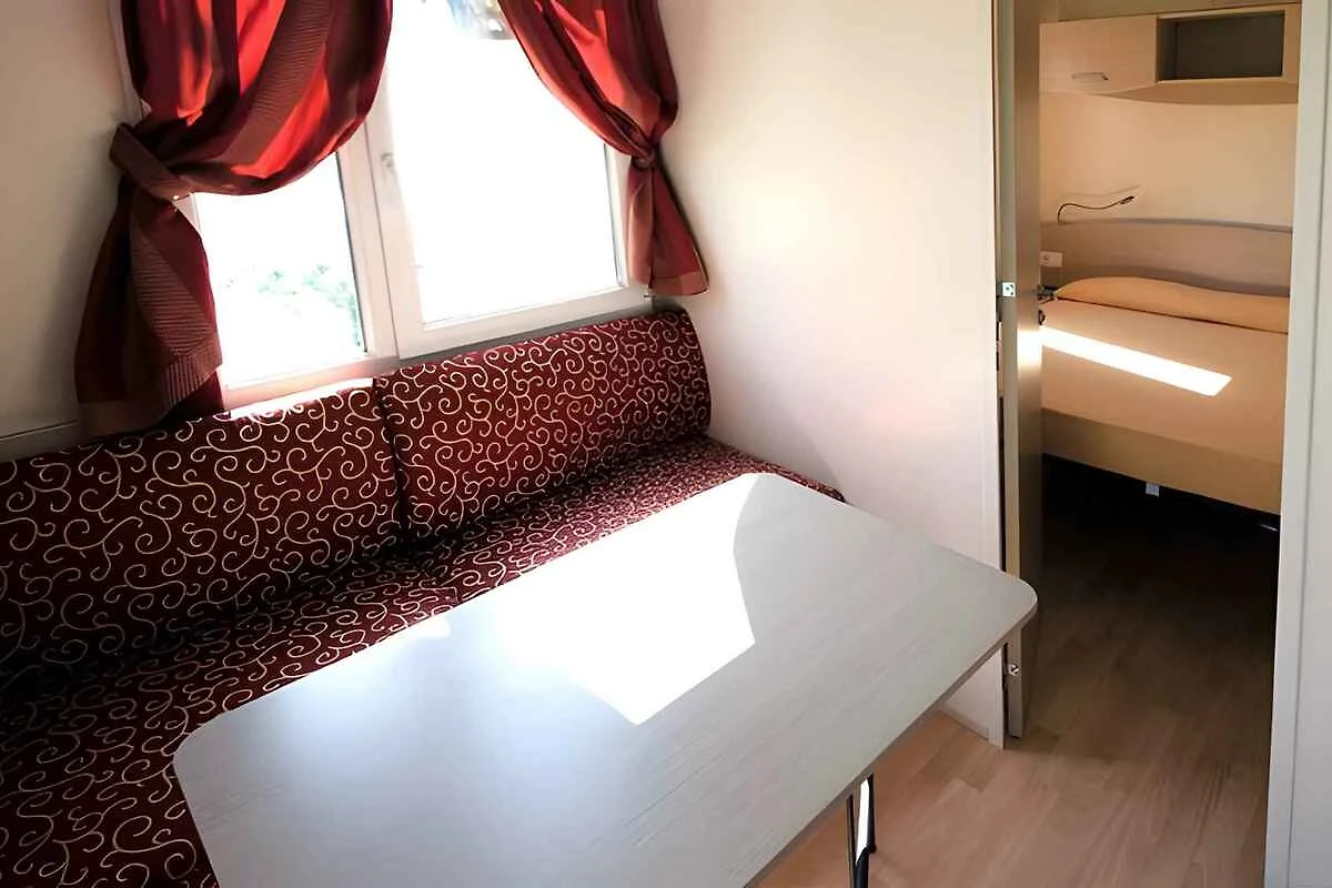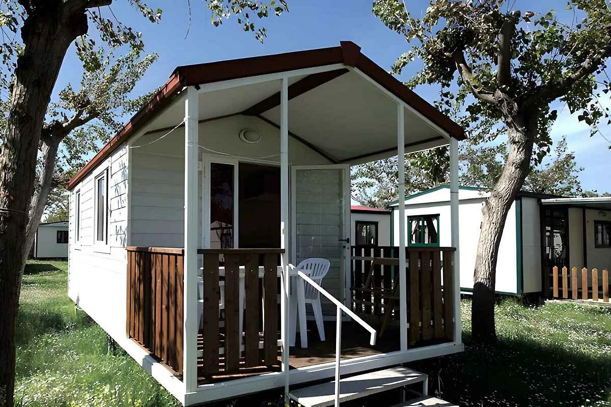 Casa mobile, 1 piano, 2 stanze (di cui 1 camera da letto), 20 mq, totale 2 letti. Su richiesta: 1 bambino fino a 2 anni in culla.