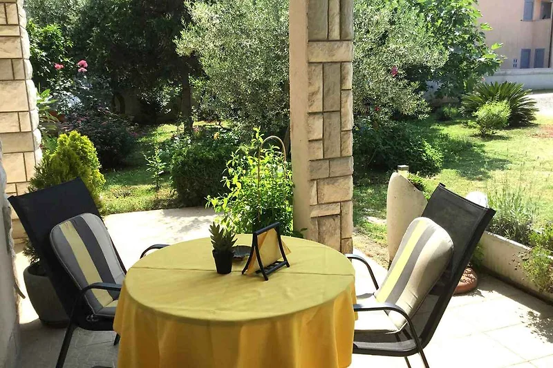 Medulin. L' appartamento vacanze si trova in una trama del giardino chiuso, grande 2000 mq con fiori, arbusti e alberi. Il padrone di casa vive stabilmente nella casa, ma usa un ingresso separato. L'accesso avviene vicino a una strada secondaria (pietrisco o ghiaia). Parcheggio (per 8 auto) sulla proprietà.