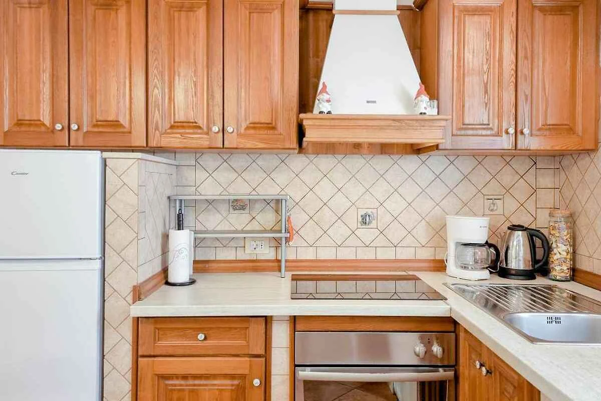 Piano terra: Cucina soggiorno (camera di passaggio) con angolo di seduta, zona pranzo (4 posti) e accesso alla terrazza (mobili da giardino). Cucina con stufa a gas, fornello elettrico, forno, lavastoviglie, frigorifero, microonde e caffettiera. Bagno con lavatrice, doccia e WC.