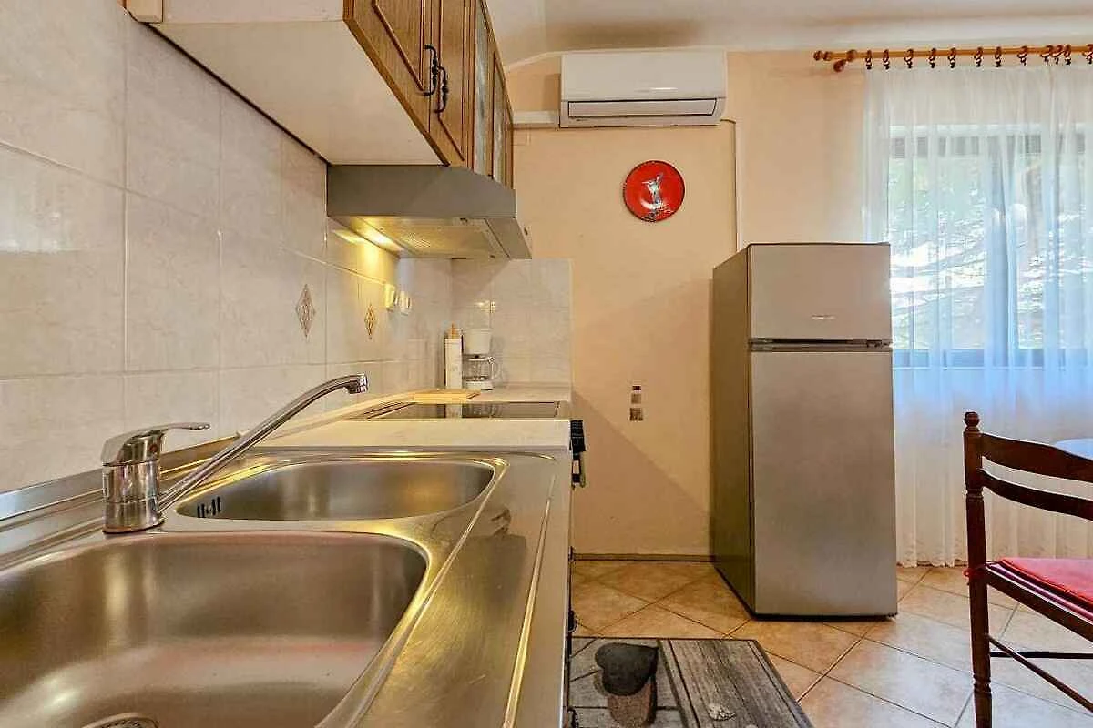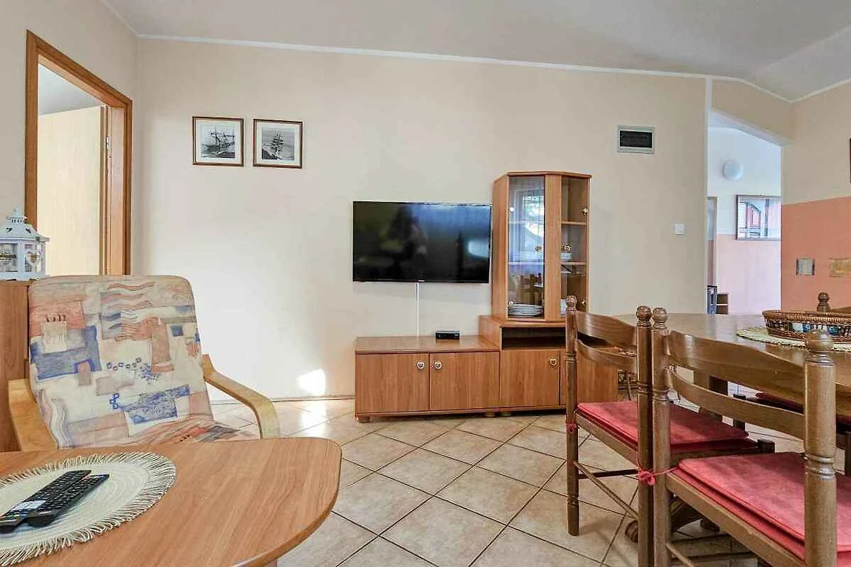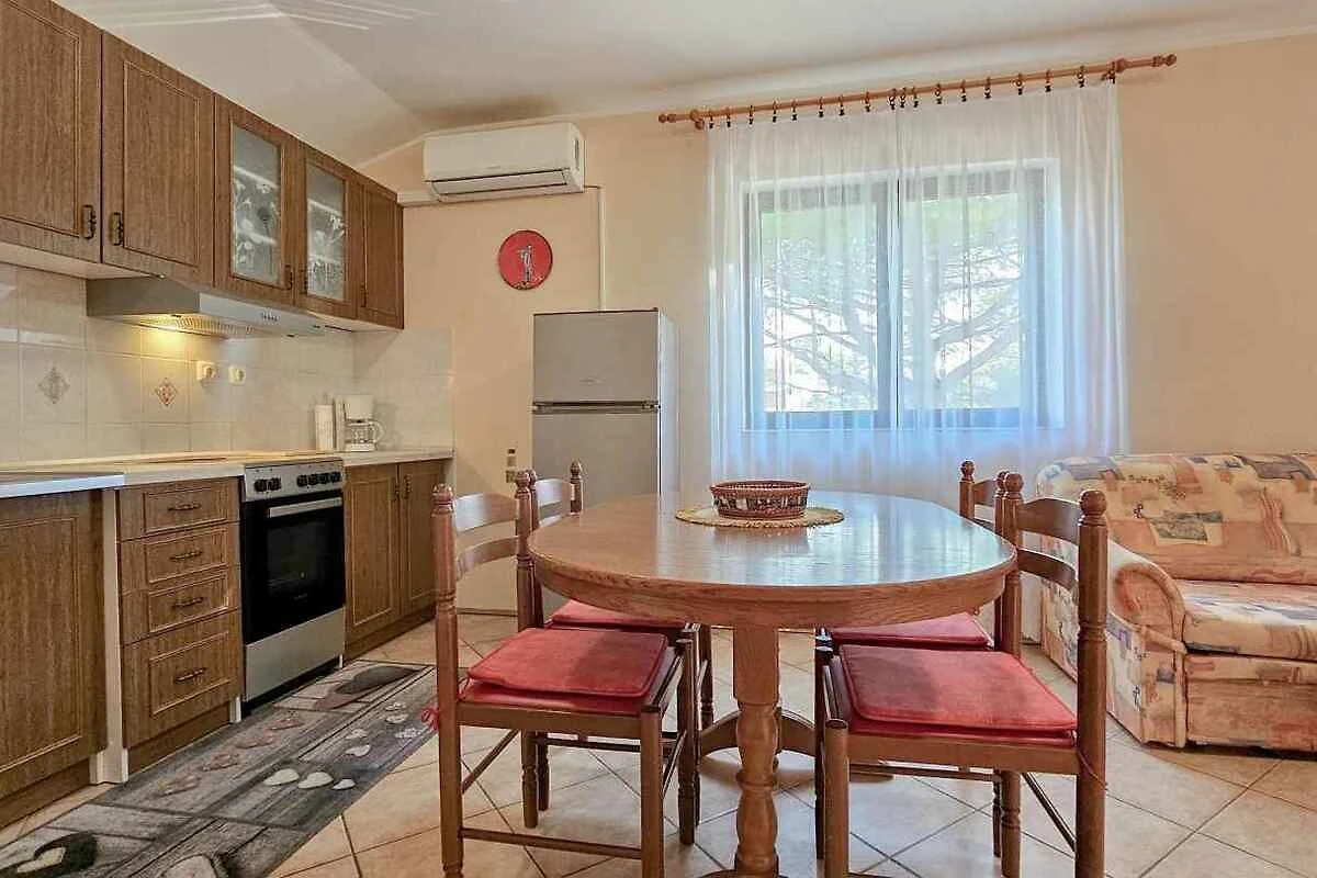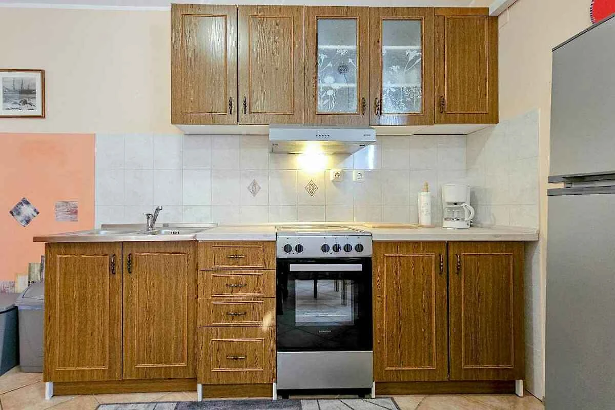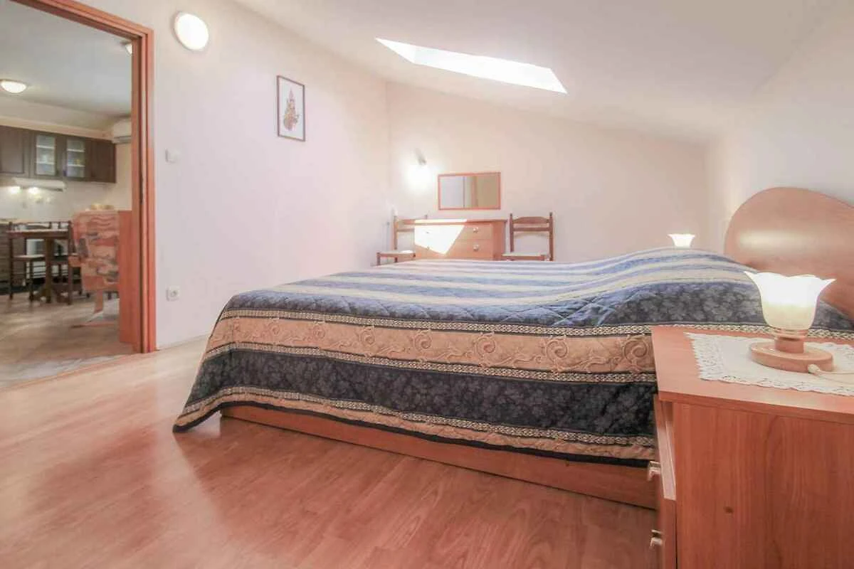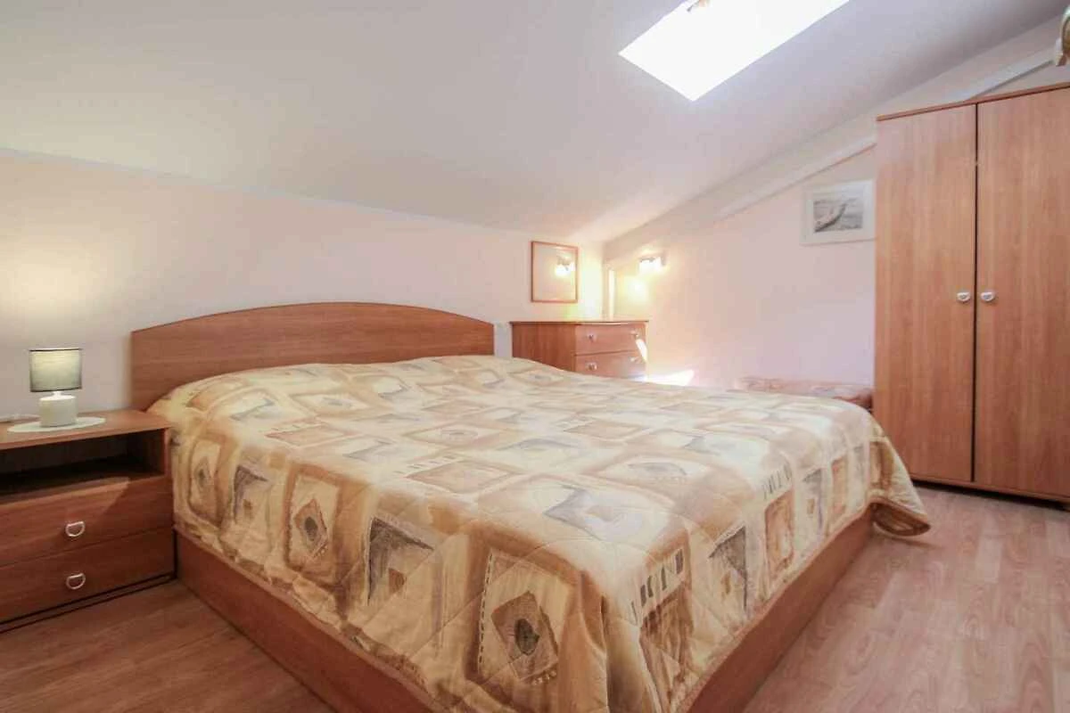 e conduce tramite una scala esterna. Cucina-soggiorno (stanza di passaggio) con angolo salotto, TV, zona pranzo (5 posti) e accesso al balcone (mobili da giardino). 2 camere da letto ciascuna con 1 letto matrimoniale. Angolo cottura nella cucina-soggiorno con cucina elettrica, forno, frigorifero e macchina da caffè. Bagno con doccia, 1 lavabo, WC e bidet.