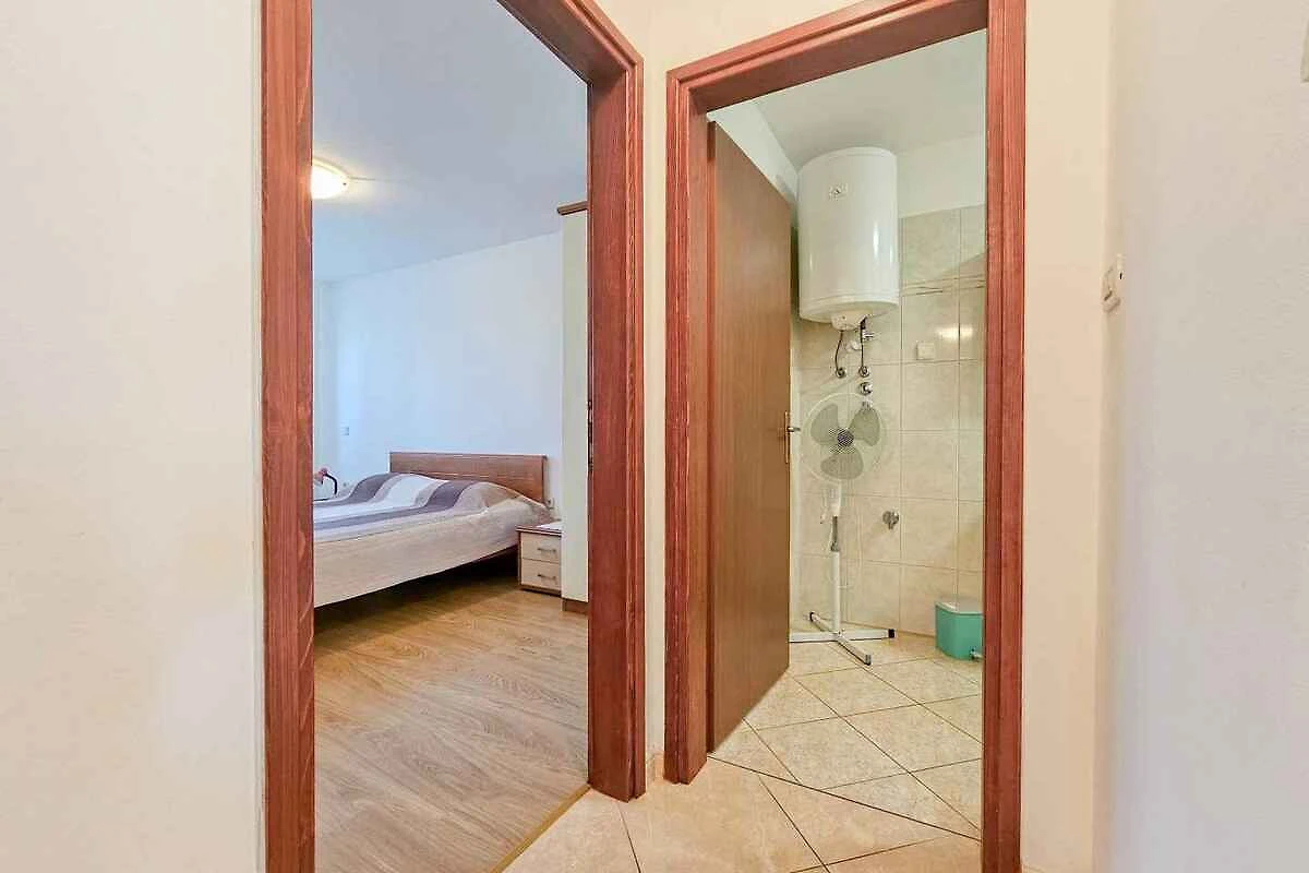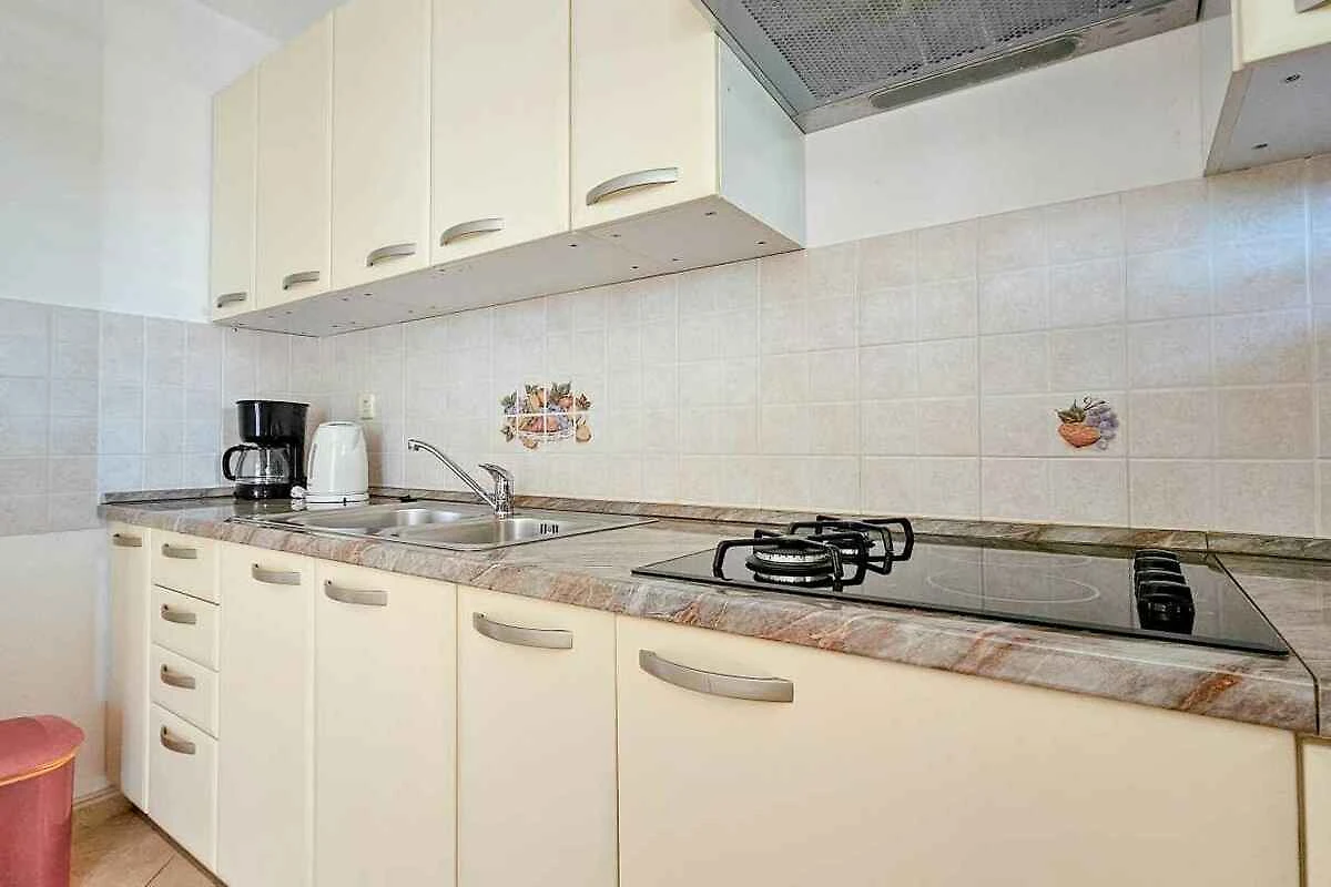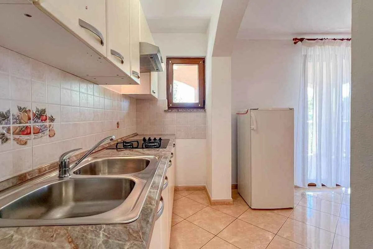 e conduce sopra una scala esterna. Cucina soggiorno (camera di passaggio) con 1 letto aggiuntivo su divano/sofa, angolo di seduta, TV, zona pranzo (3 posti) e accesso al balcone (coperto, mobili da giardino). Camera da letto con 1 letto matrimoniale. Angolo cucina nella cucina soggiorno con stufa a gas, fornello elettrico, frigorifero e caffettiera. Bagno con doccia, 1 lavandino e WC.