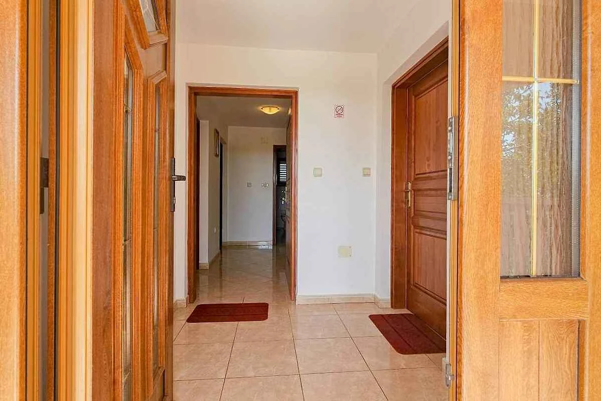 e conduce sopra una scala esterna. Cucina soggiorno (camera di passaggio) con 1 letto aggiuntivo su divano/sofa, angolo di seduta, TV, zona pranzo (5 posti) e accesso al balcone (coperto, mobili da giardino). 2 camere da letto tutto a con 1 letto matrimoniale. Angolo cucina nella cucina soggiorno con stufa a gas, fornello elettrico, forno, frigorifero e caffettiera. Bagno con doccia, 1 lavandino e WC.