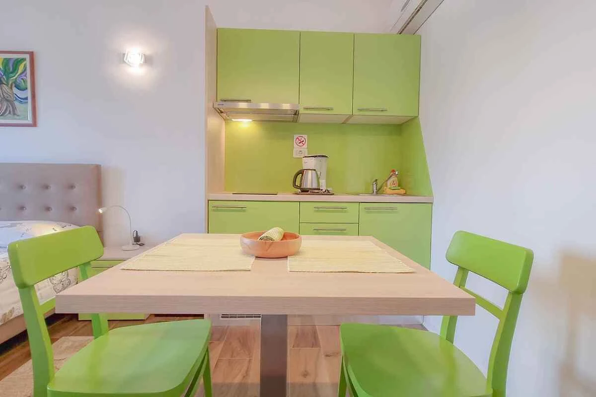e conduce sopra una scala esterna direttamente nel soggiorno/camera da letto. Camera da letto (camera di passaggio) con 1 letto matrimoniale. La cucinetta in soggiorno/camera da letto con zona pranzo (2 posti), (fornello a induzione, 2 fornelli), frigorifero, caffettiera e bollitore elettrico. Bagno con doccia, 1 lavandino e WC.