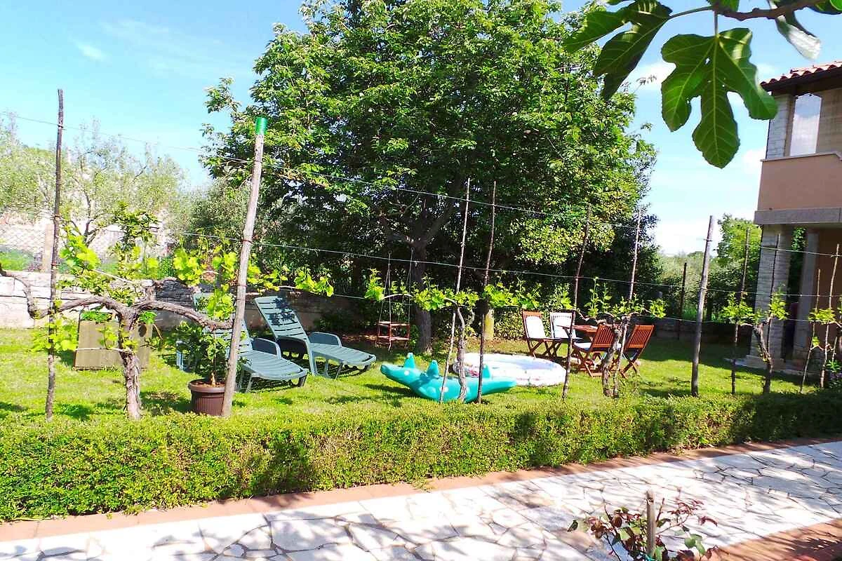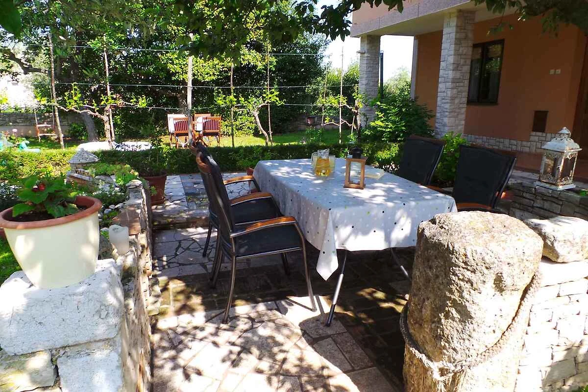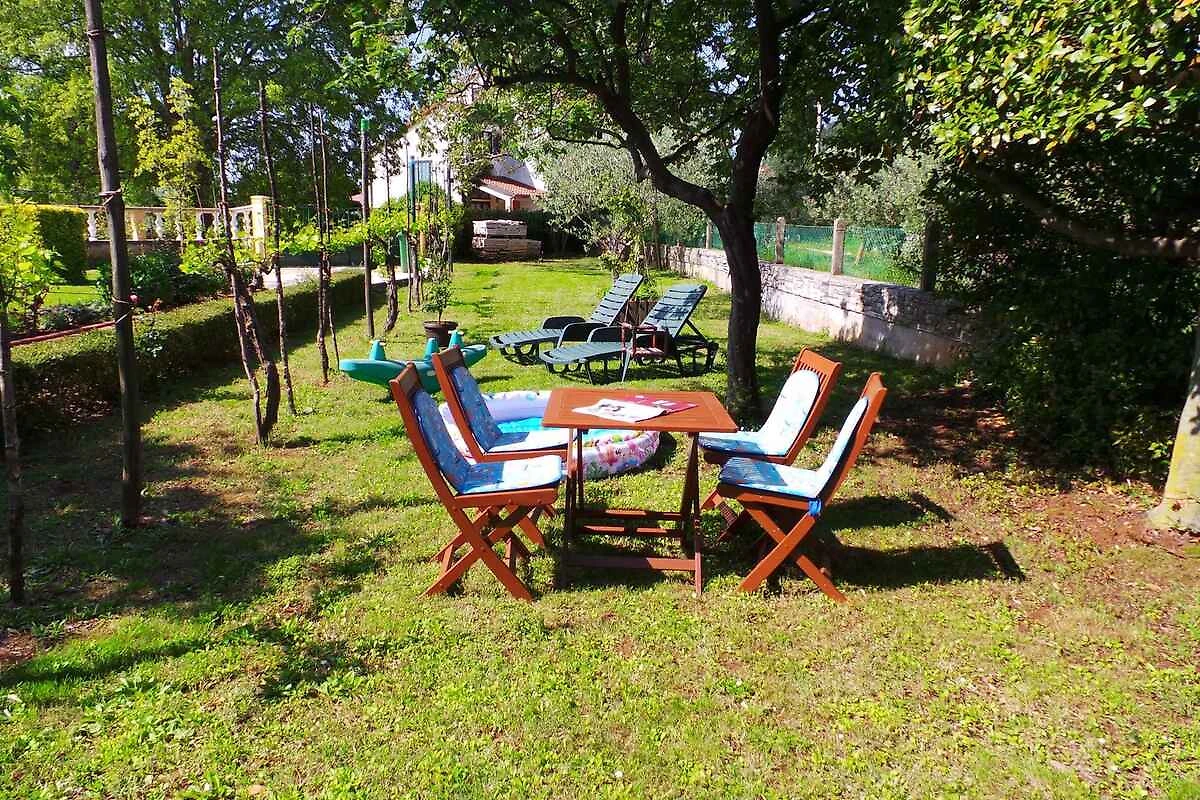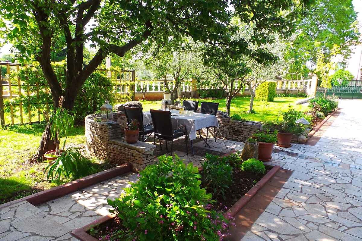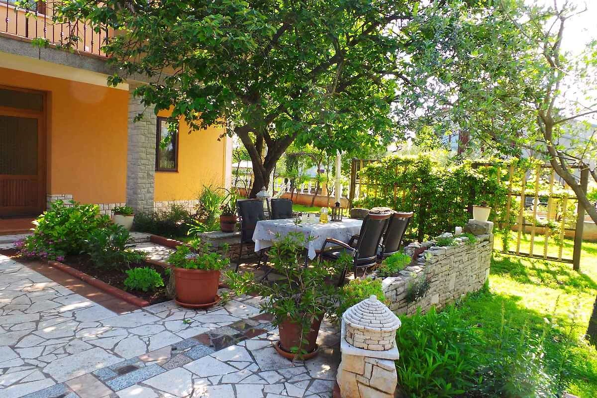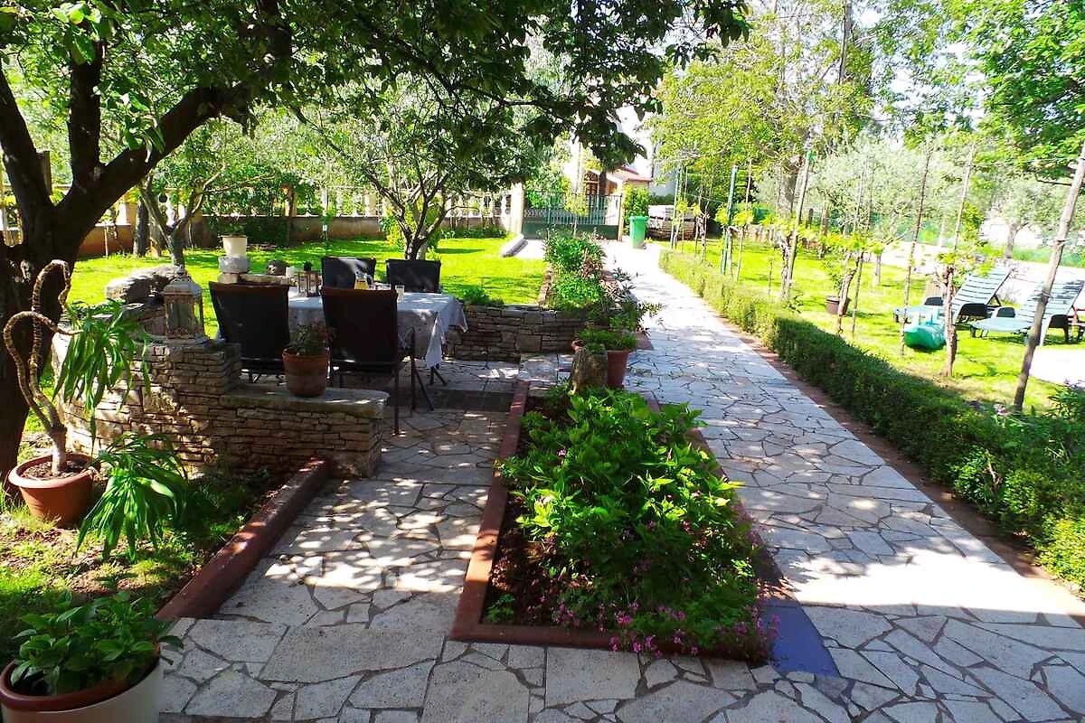 Muntić. L' appartamento vacanze si trova in una trama del giardino chiuso, grande 1500 mq con prato, fiori, arbusti e alberi, delimitata da una recinzione. Il padrone di casa vive stabilmente nella casa, ma usa un ingresso separato. L'accesso avviene vicino a una strada secondaria. Parcheggio (per 3 auto) sulla proprietà.