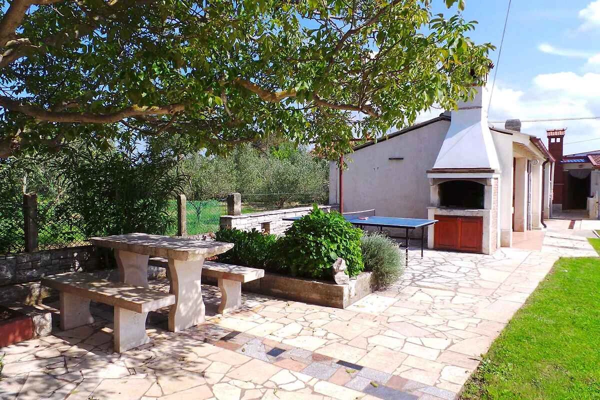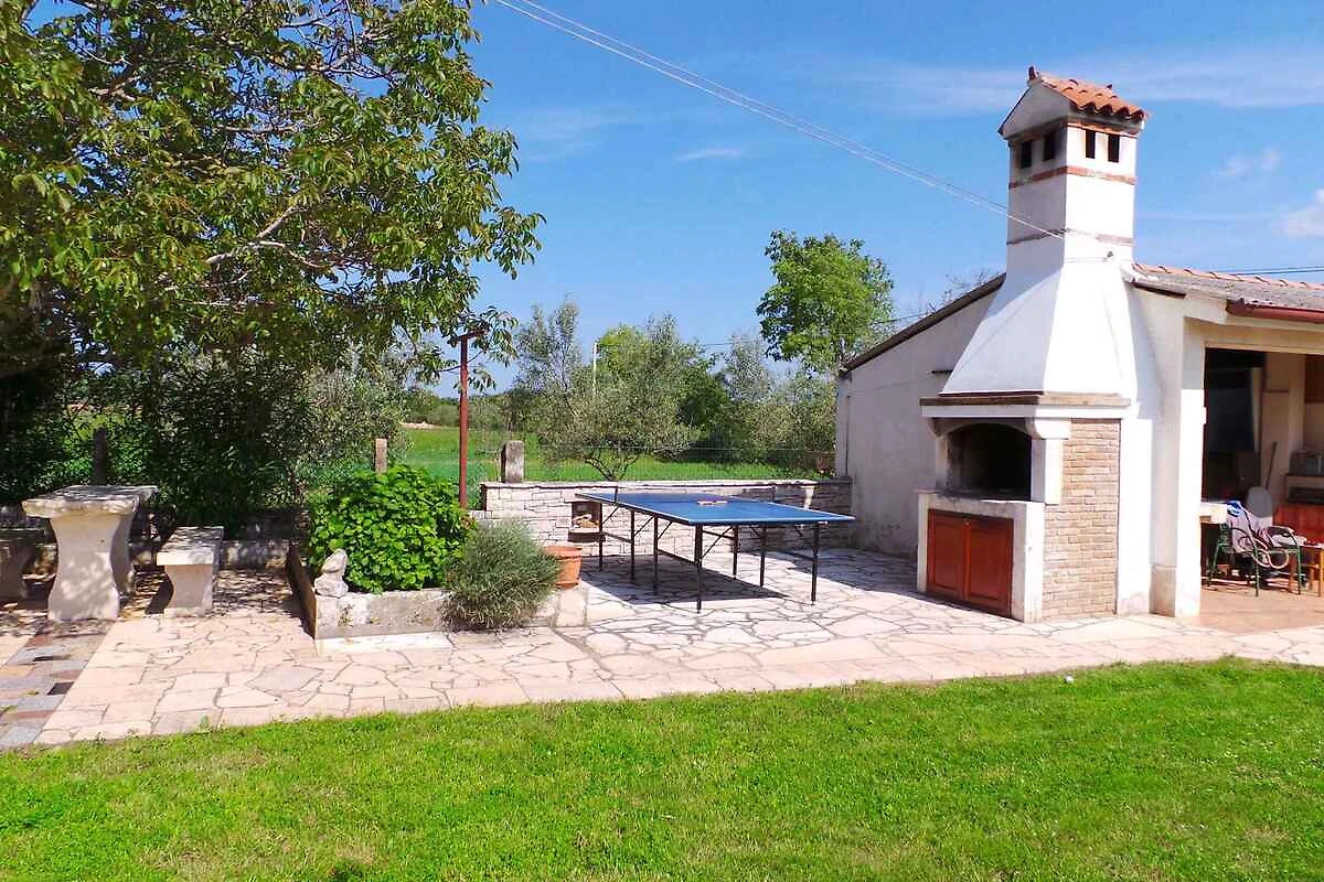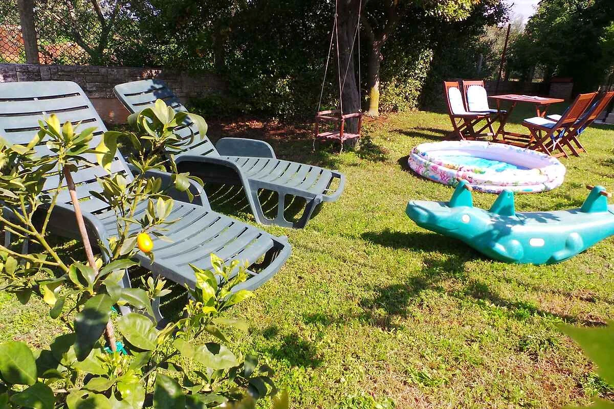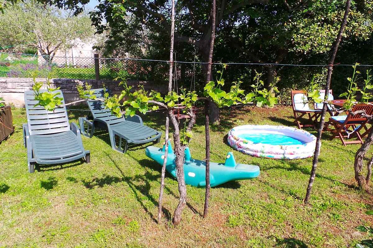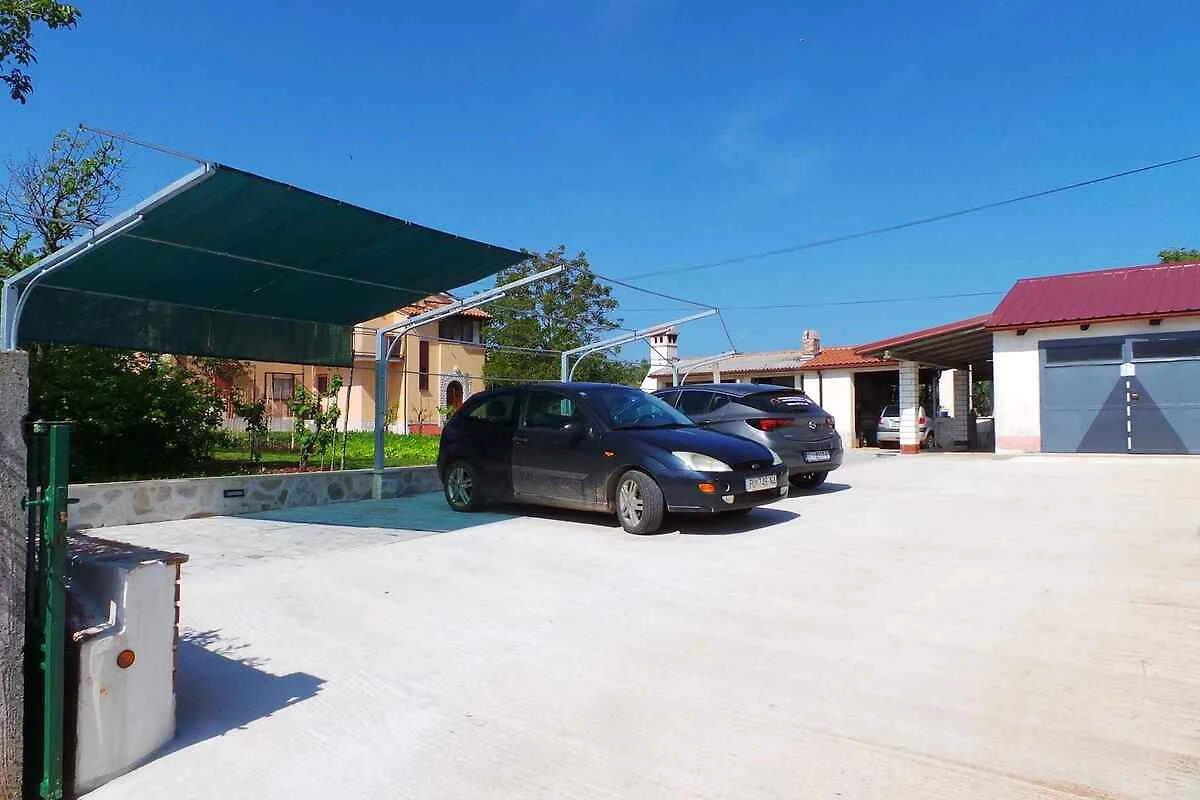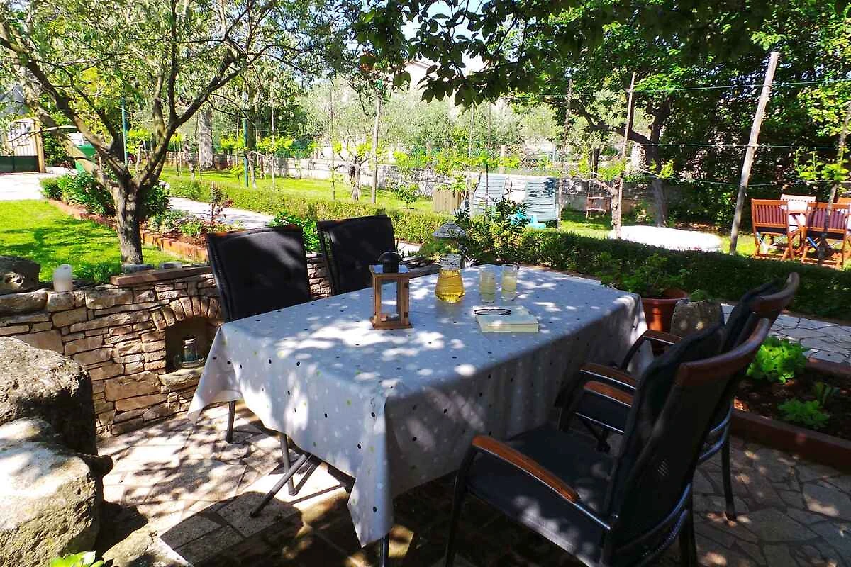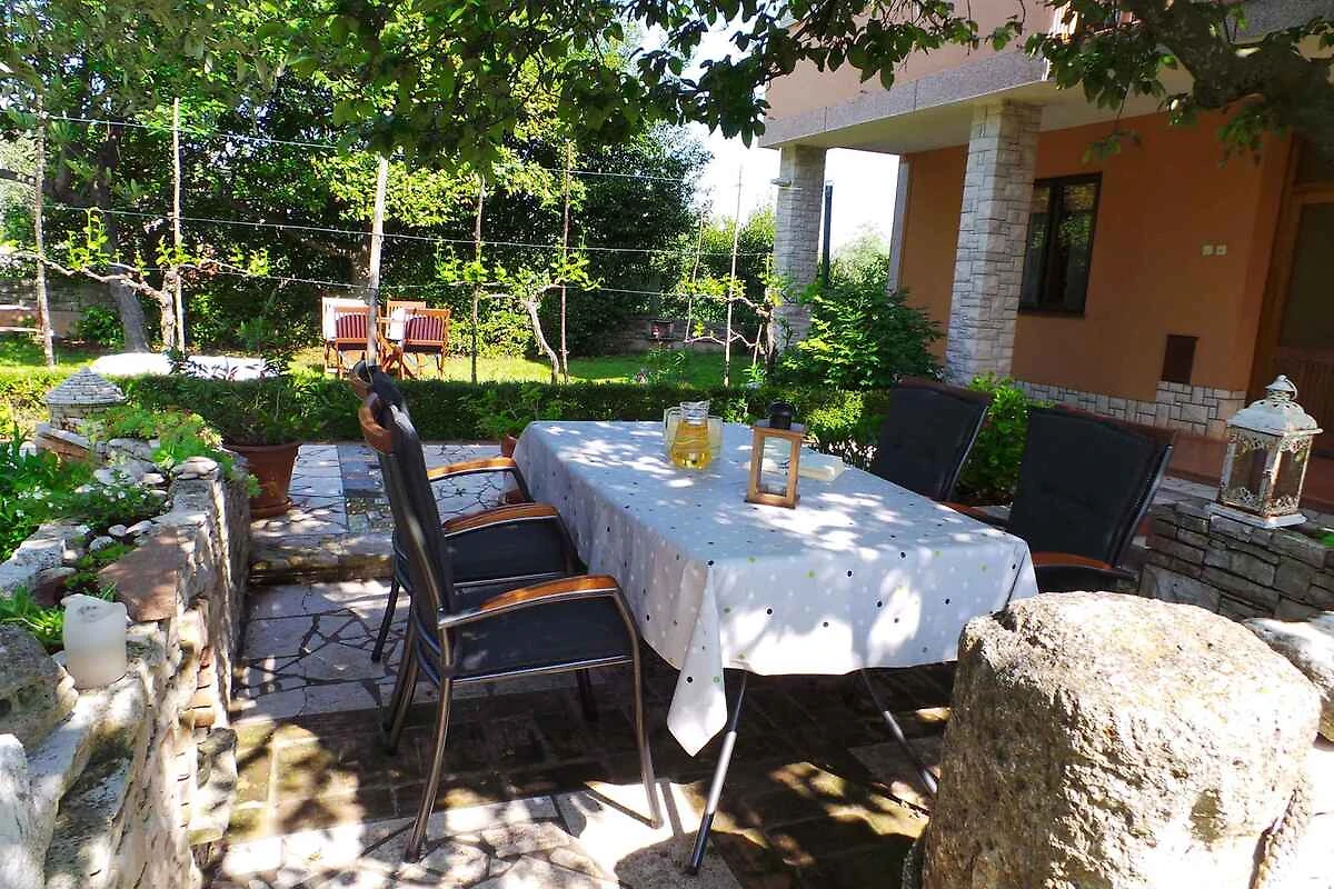 Muntić. L' appartamento vacanze si trova in una trama del giardino chiuso, grande 1500 mq con prato, fiori, arbusti e alberi, delimitata da una recinzione. Il padrone di casa vive stabilmente nella casa, ma usa un ingresso separato. L'accesso avviene vicino a una strada secondaria. Parcheggio (per 3 auto) sulla proprietà.