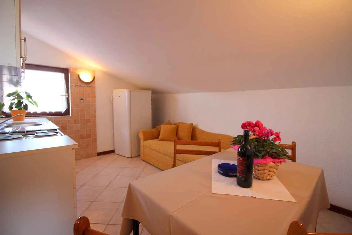 L'ingresso del vostro appartamento si trova nell'attico. Cucina soggiorno con angolo di seduta, TV e zona pranzo. Camera da letto con 2 letti singoli e accesso al balcone (mobili da giardino). Angolo cucina nella cucina soggiorno con fornello elettrico, frigorifero (scomparto del ghiaccio), caffettiera, tostapane e bollitore elettrico. Bagno con doccia, 1 lavandino e WC.
