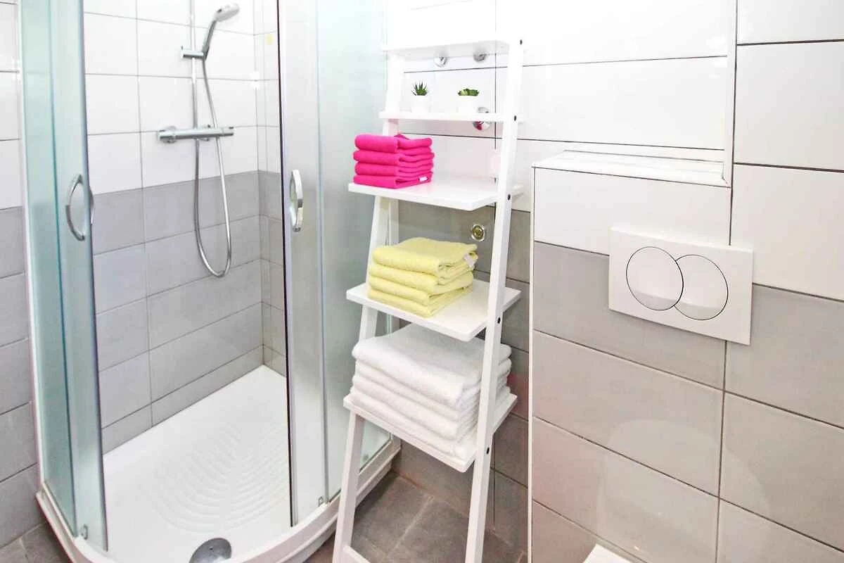 L'ingresso al vostro appartamento per le vacanze si trova al piano rialzato e conduce attraverso una scala esterna. Soggiorno con 1 letto aggiuntivo su divano/sofà, TV e accesso al balcone (6 mq, mobili da giardino). Camera da letto con 2 letti singoli. Camera da letto con 1 letto matrimoniale. Cucina con angolo pranzo (4 posti), fornello elettrico, forno, frigorifero, macchina da caffè e bollitore elettrico. Bagno con doccia, 1 lavandino e WC.