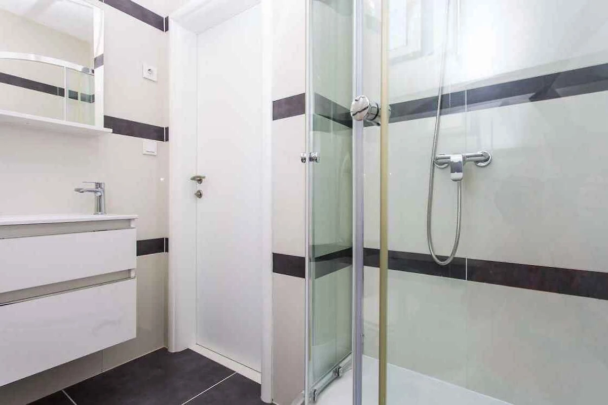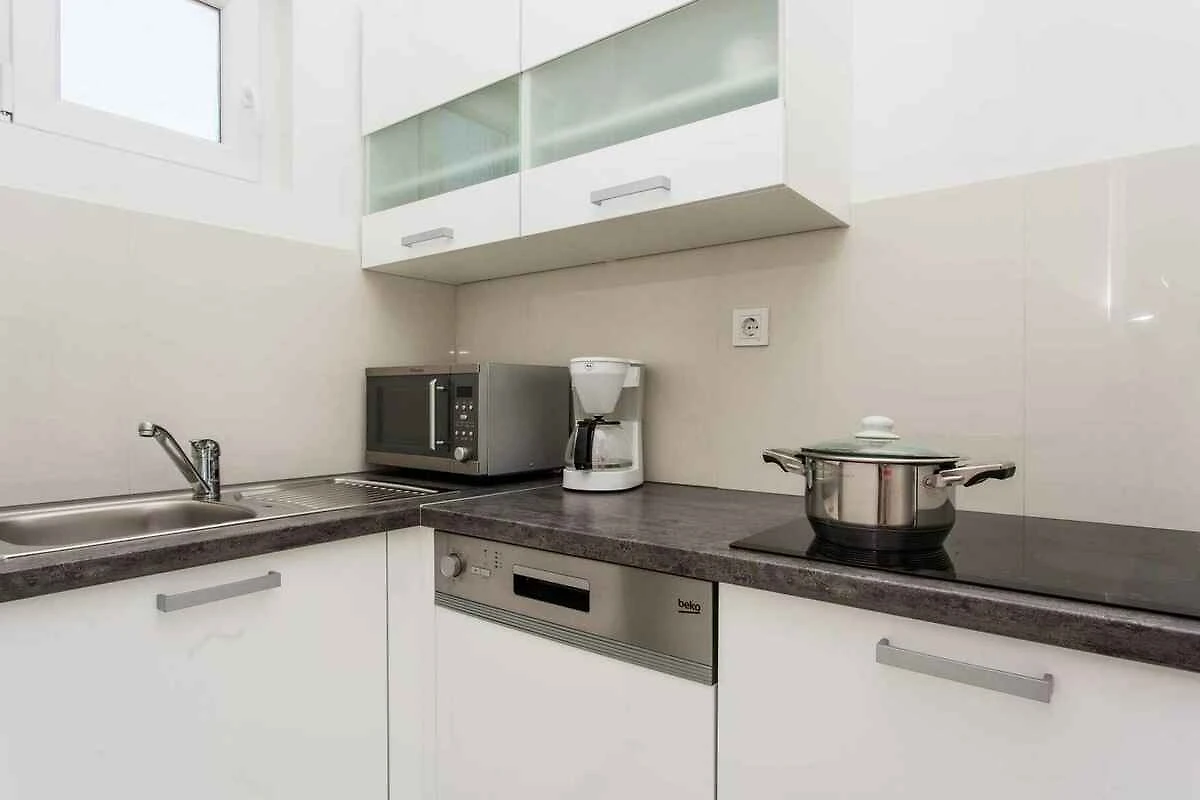 L'ingresso del vostro appartamento per le vacanze si trova al 2° piano. Soggiorno con 2 posti letto aggiuntivi su divano/sofa, angolo salotto, TV, aria condizionata, zona pranzo (6 posti) e accesso al balcone. 2 camere da letto ciascuna con 1 letto matrimoniale. Cucina con piano cottura elettrico, forno, frigorifero (scomparto freezer), microonde e macchina da caffè. Bagno con doccia, 1 lavabo e WC.