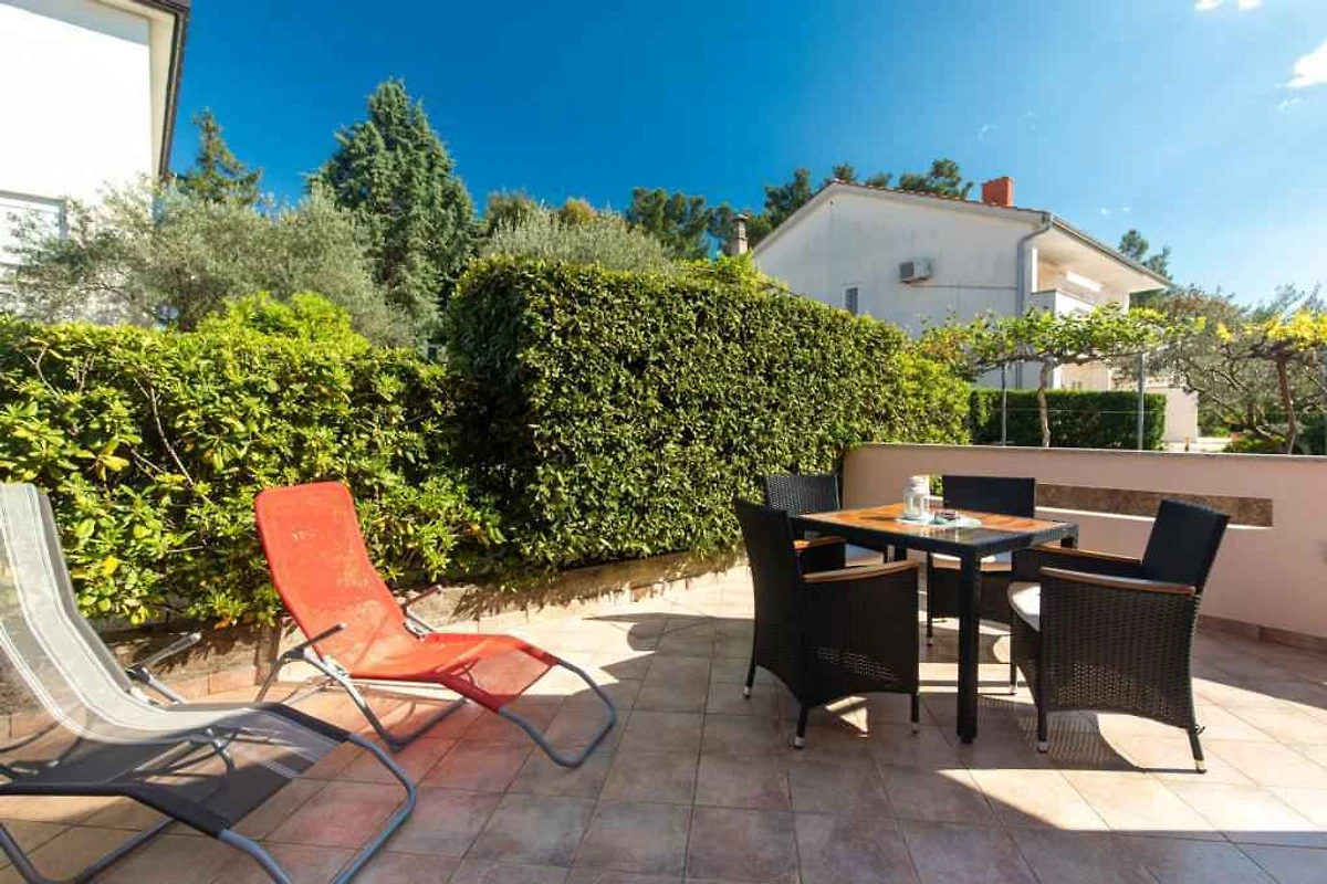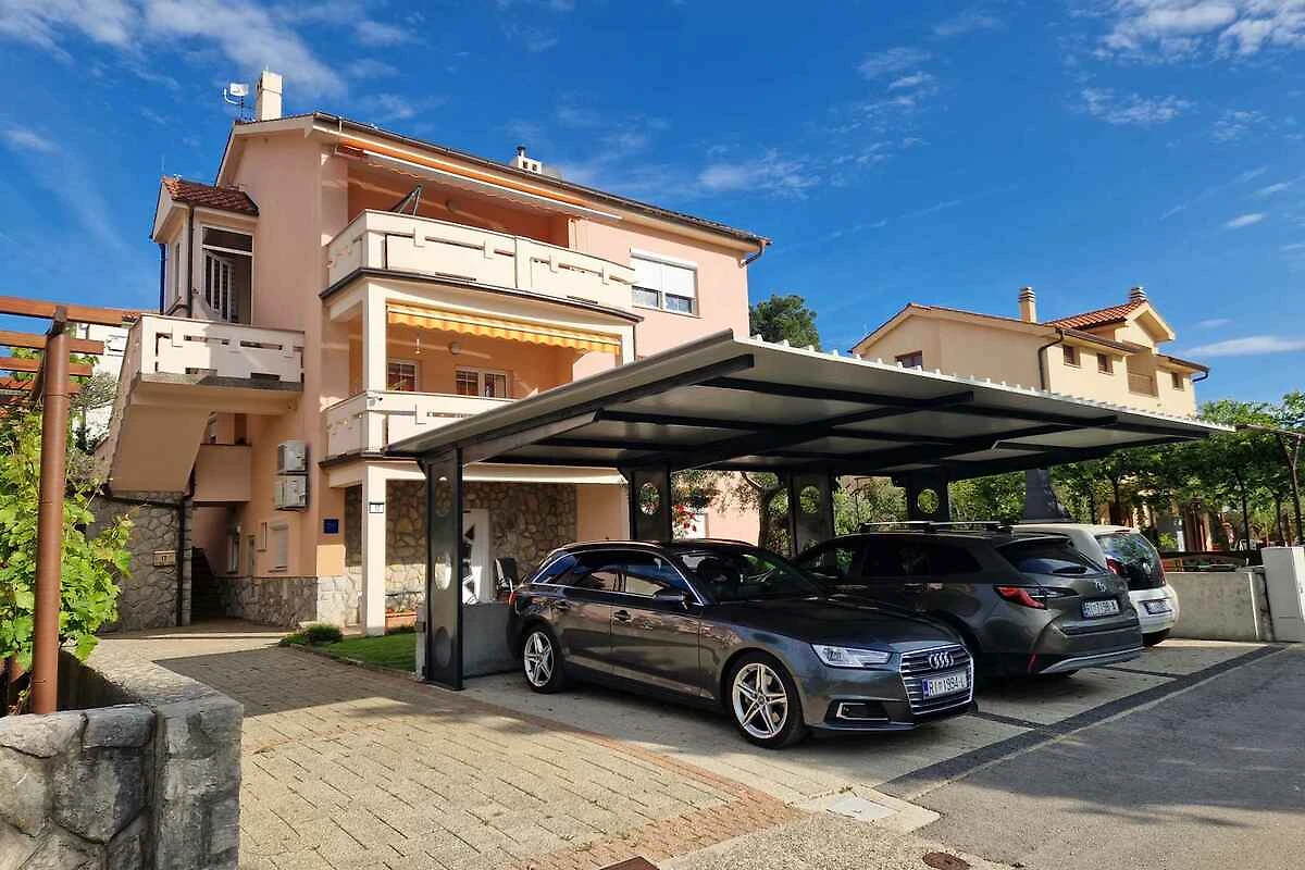 Krk, frazione Jezevac. L'appartamento per le vacanze si trova su un terreno aperto con fiori e arbusti. Il locatore abita permanentemente nella casa, ma utilizza un ingresso separato. L'accesso avviene tramite una strada secondaria (asfaltata). Parcheggio (per 2 auto) sulla proprietà.