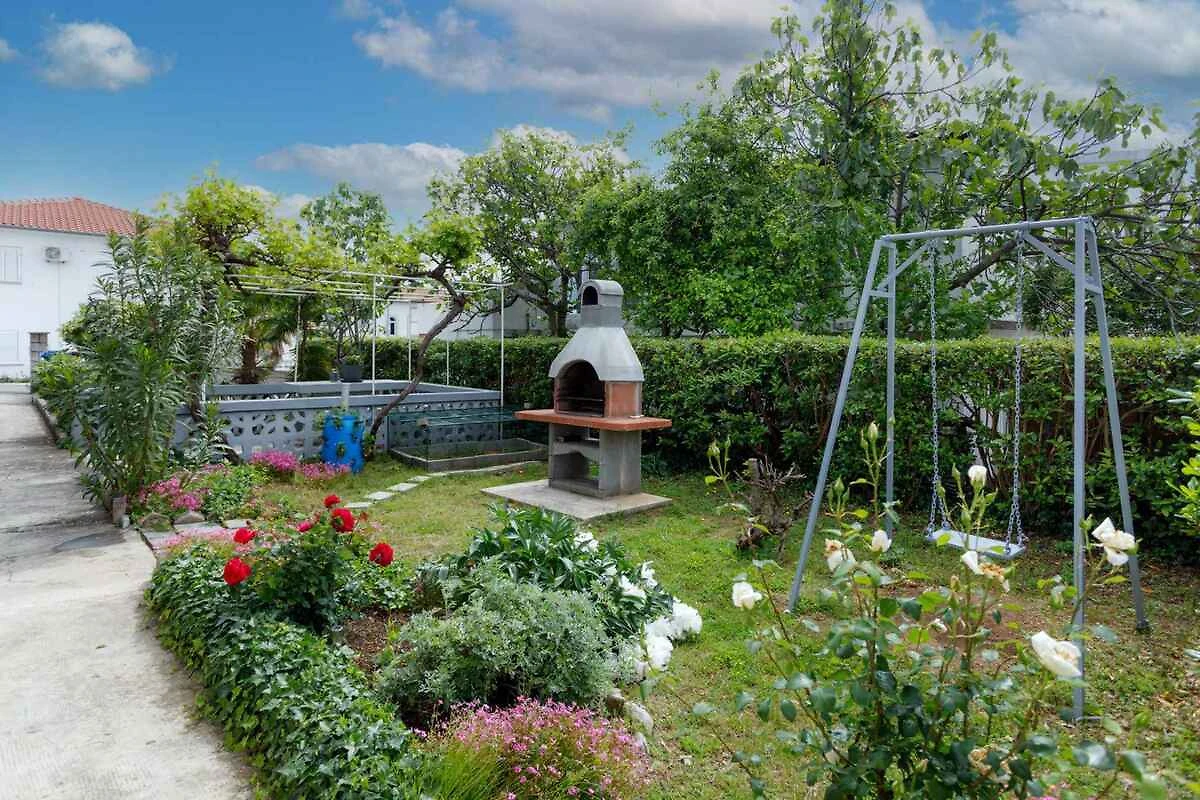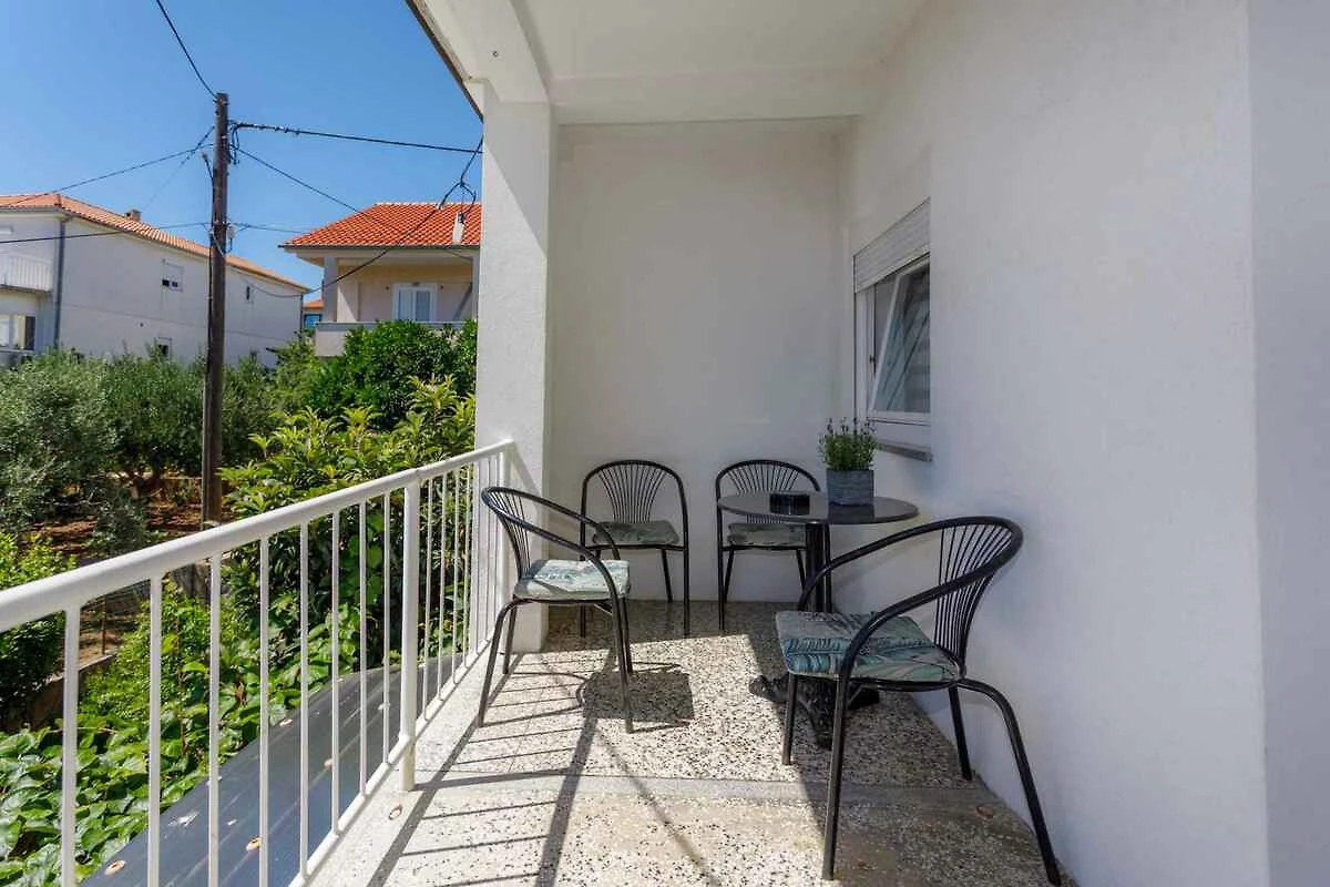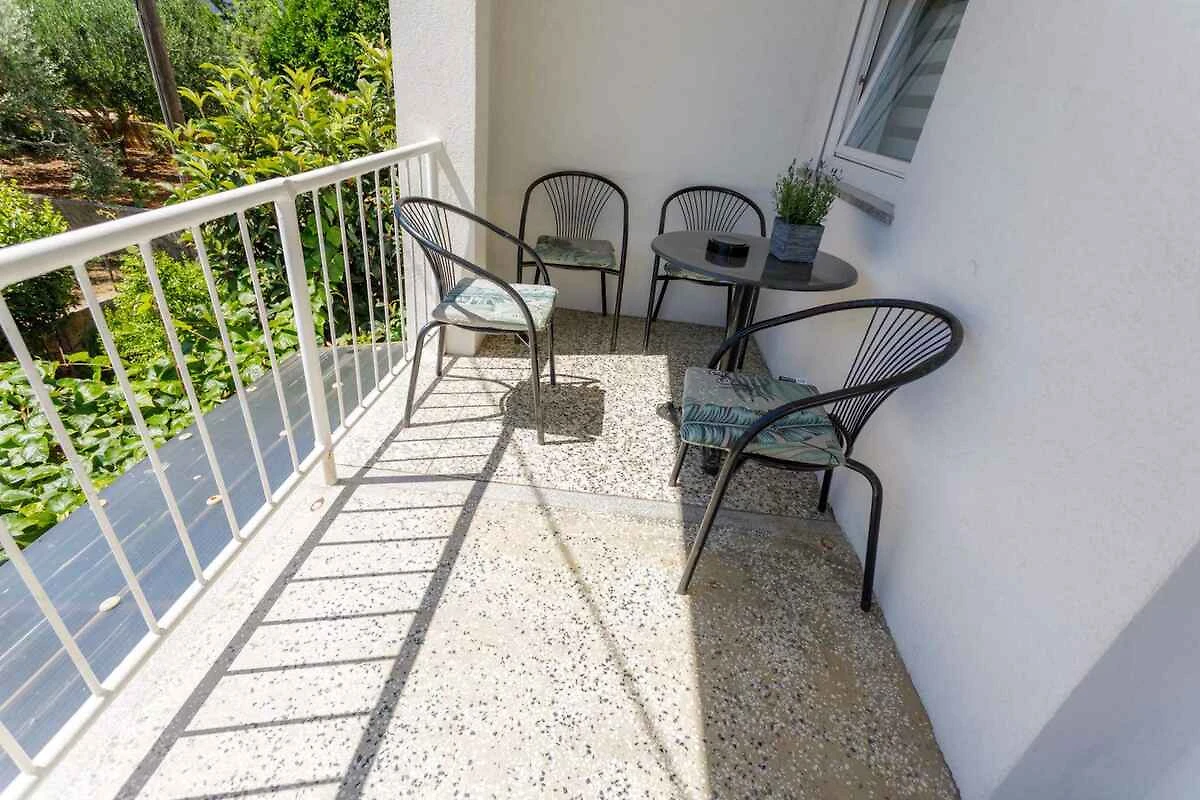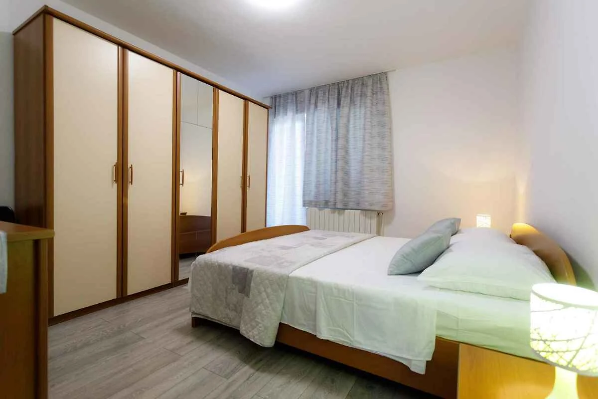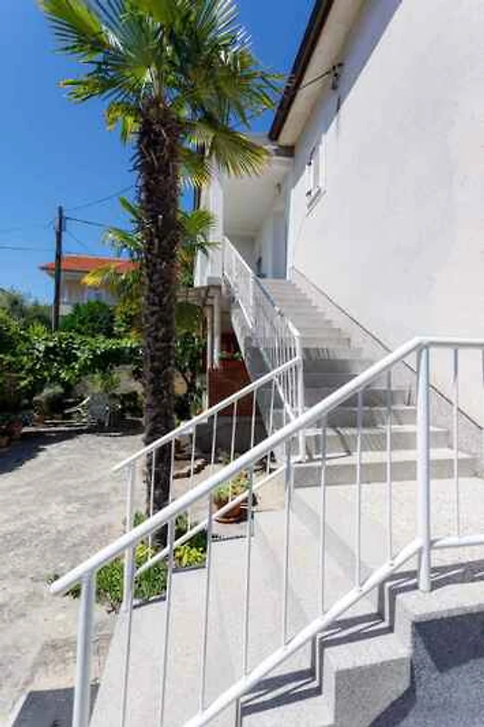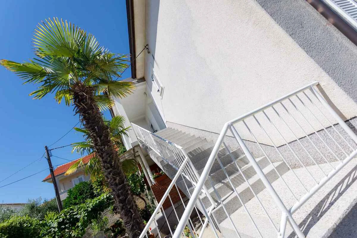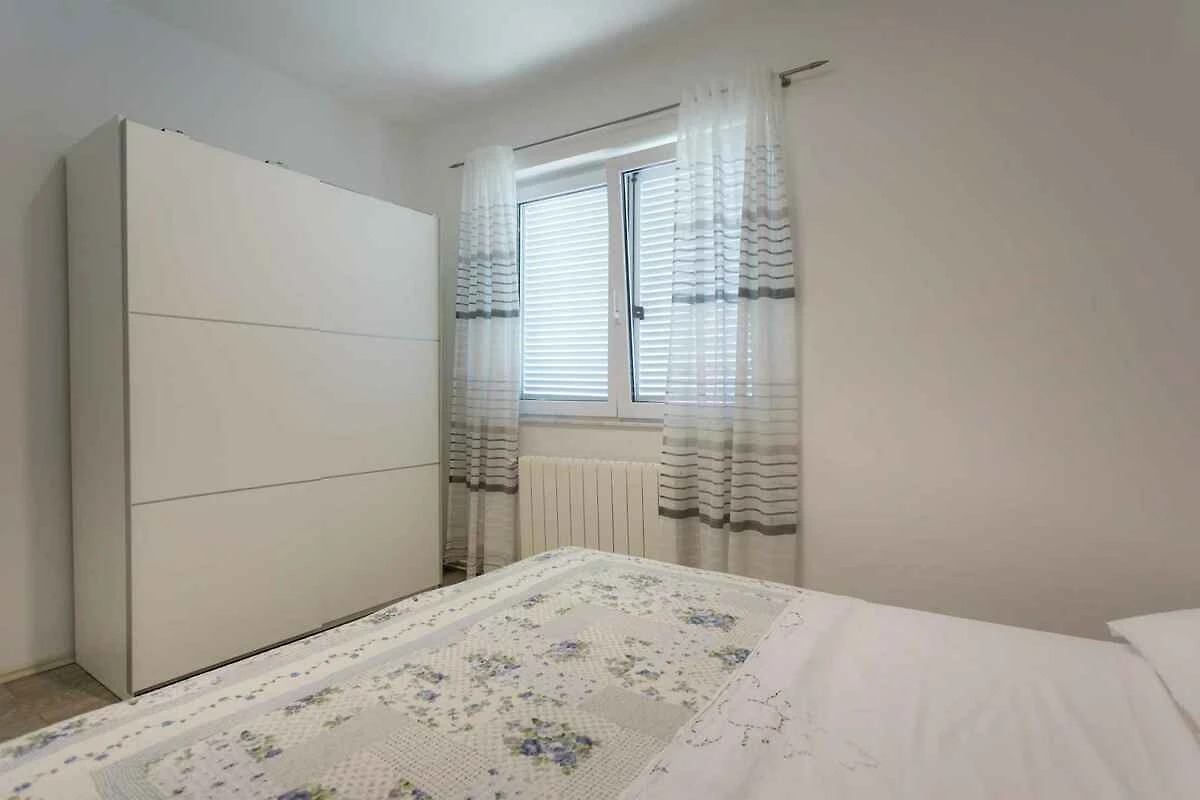 Krk. L' appartamento si trova in una trama del giardino chiuso. Il padrone di casa vive in un altro edificio nella stessa proprietá. L'accesso avviene vicino a una strada secondaria. Parcheggio (per 1 auto) sulla proprietà.