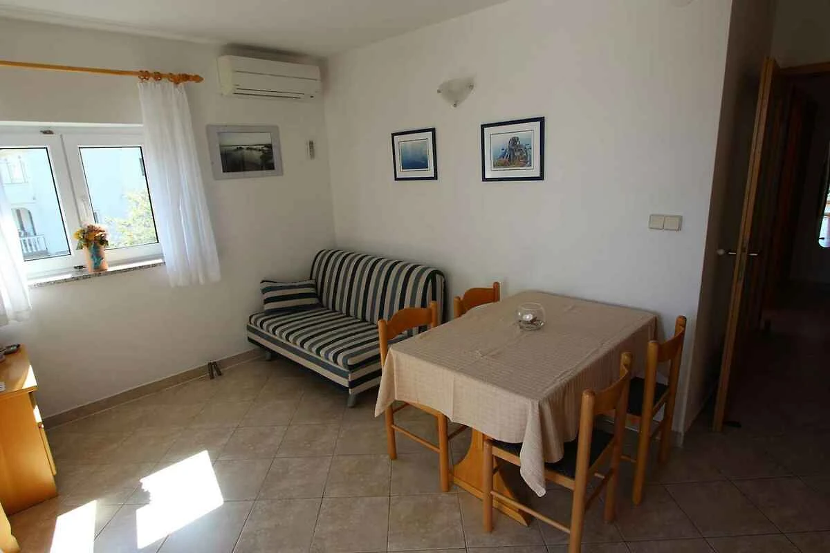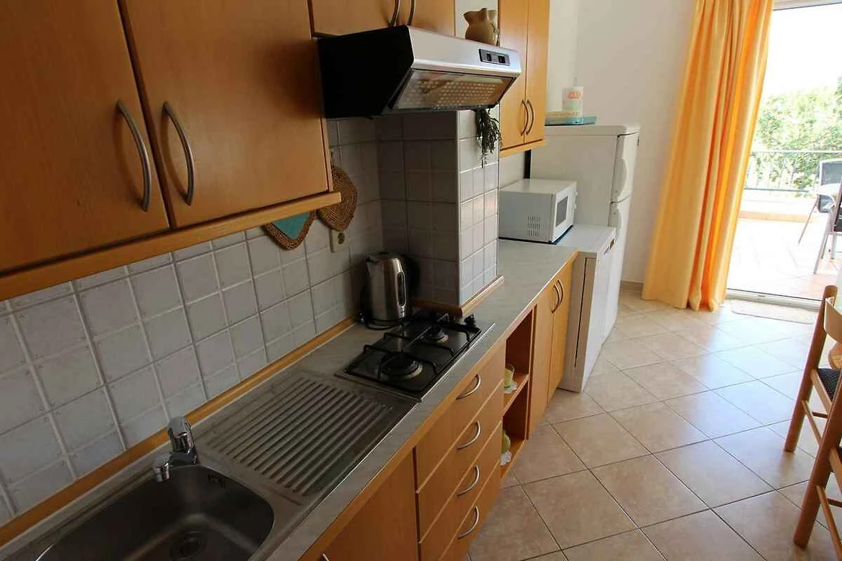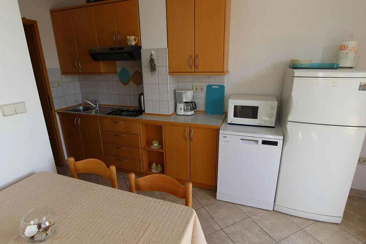 e conduce direttamente nella cucina abitabile. Soggiorno con angolo di seduta, TV, zona pranzo (4 posti), accesso al balcone e vista mare. Camera da letto con 2 letti singoli. Camera da letto con 1 letto matrimoniale. Cucina in soggiorno/camera da letto con stufa a gas, lavastoviglie, frigorifero (scomparto del ghiaccio), microonde e caffettiera. Bagno con doccia e WC.