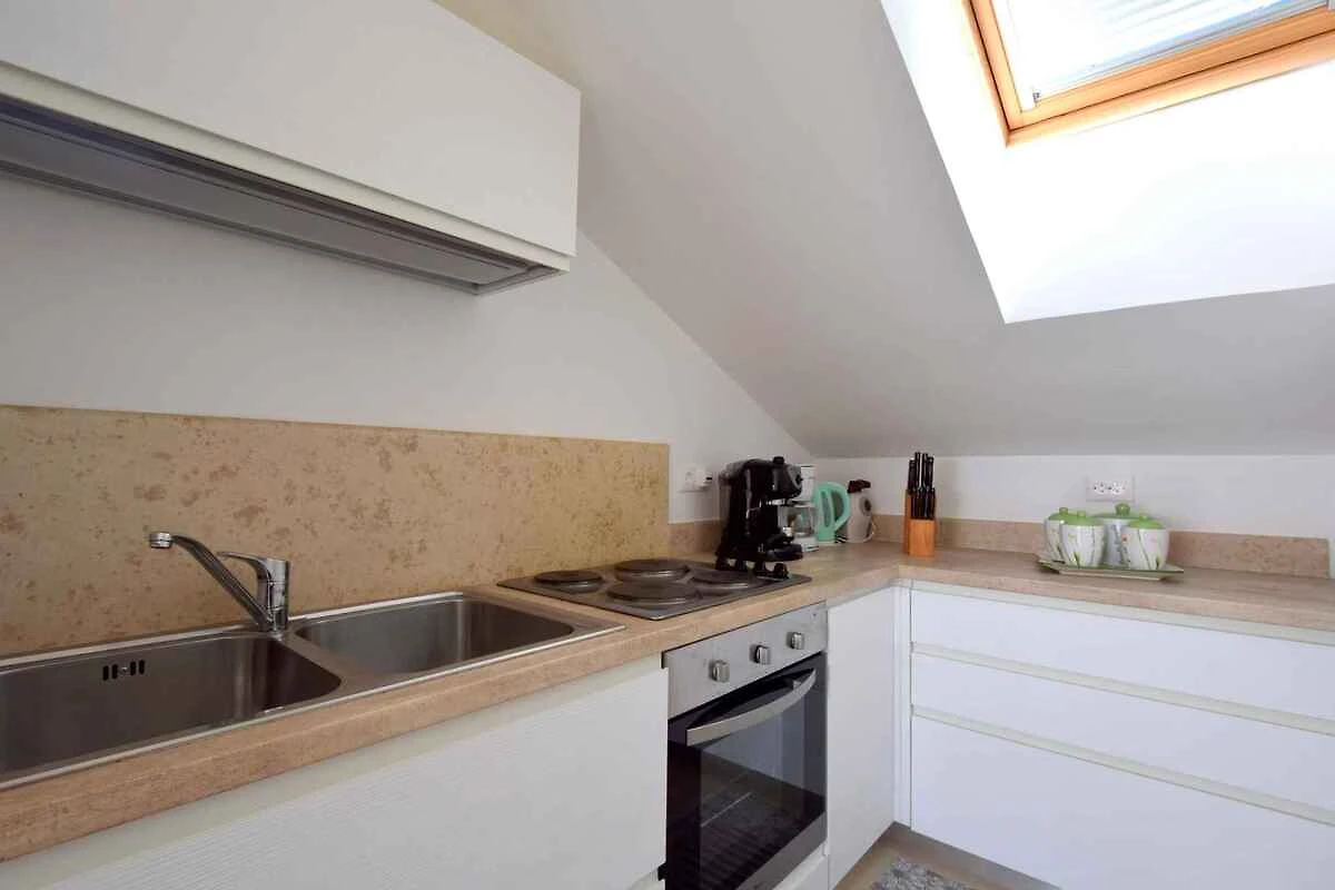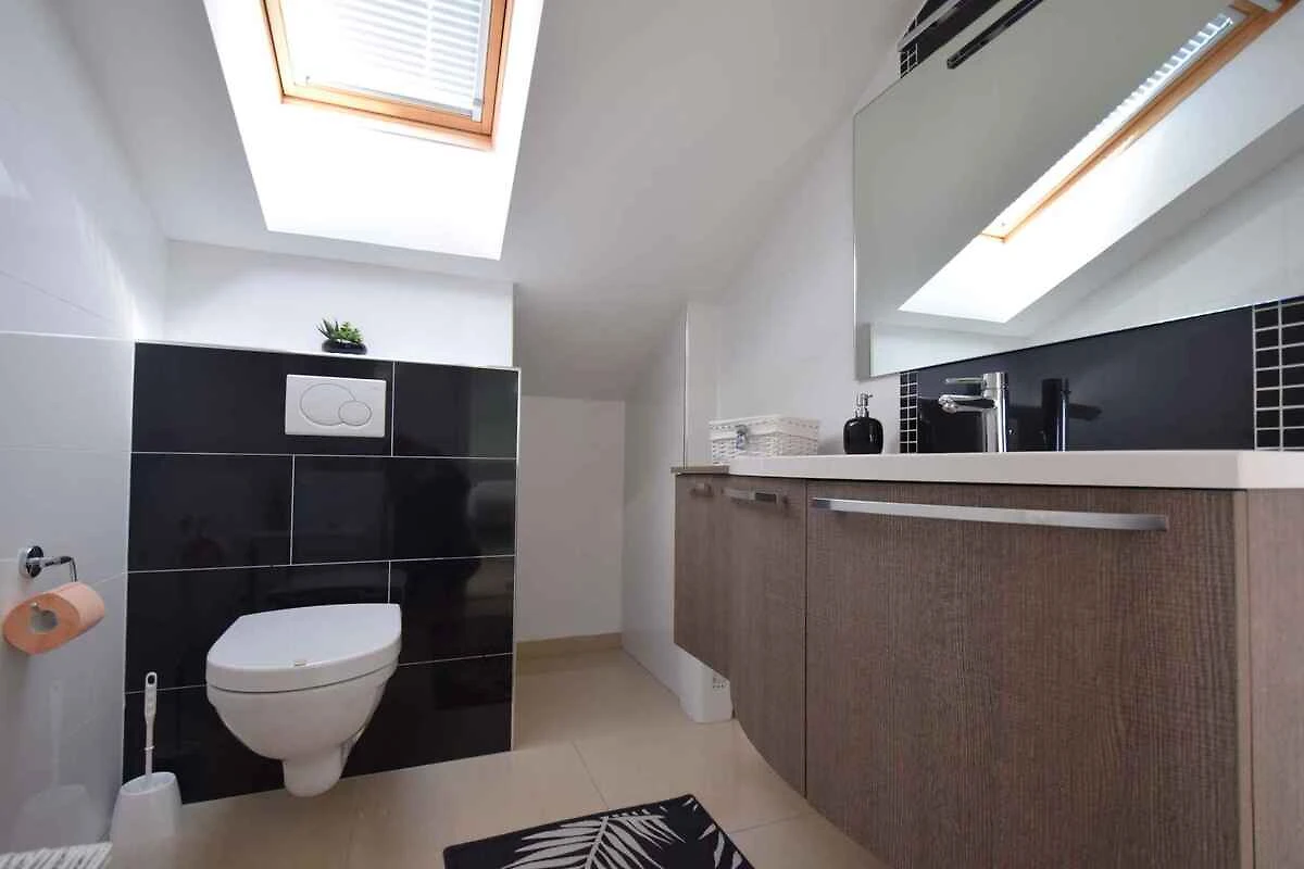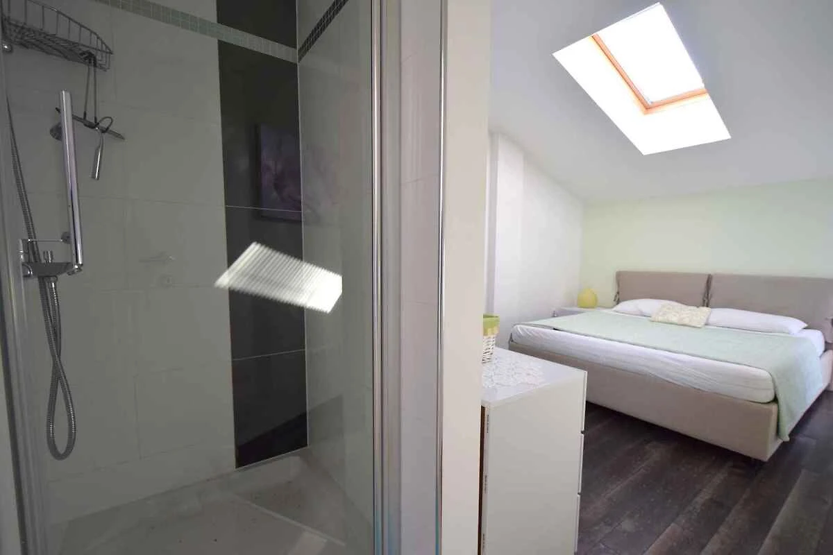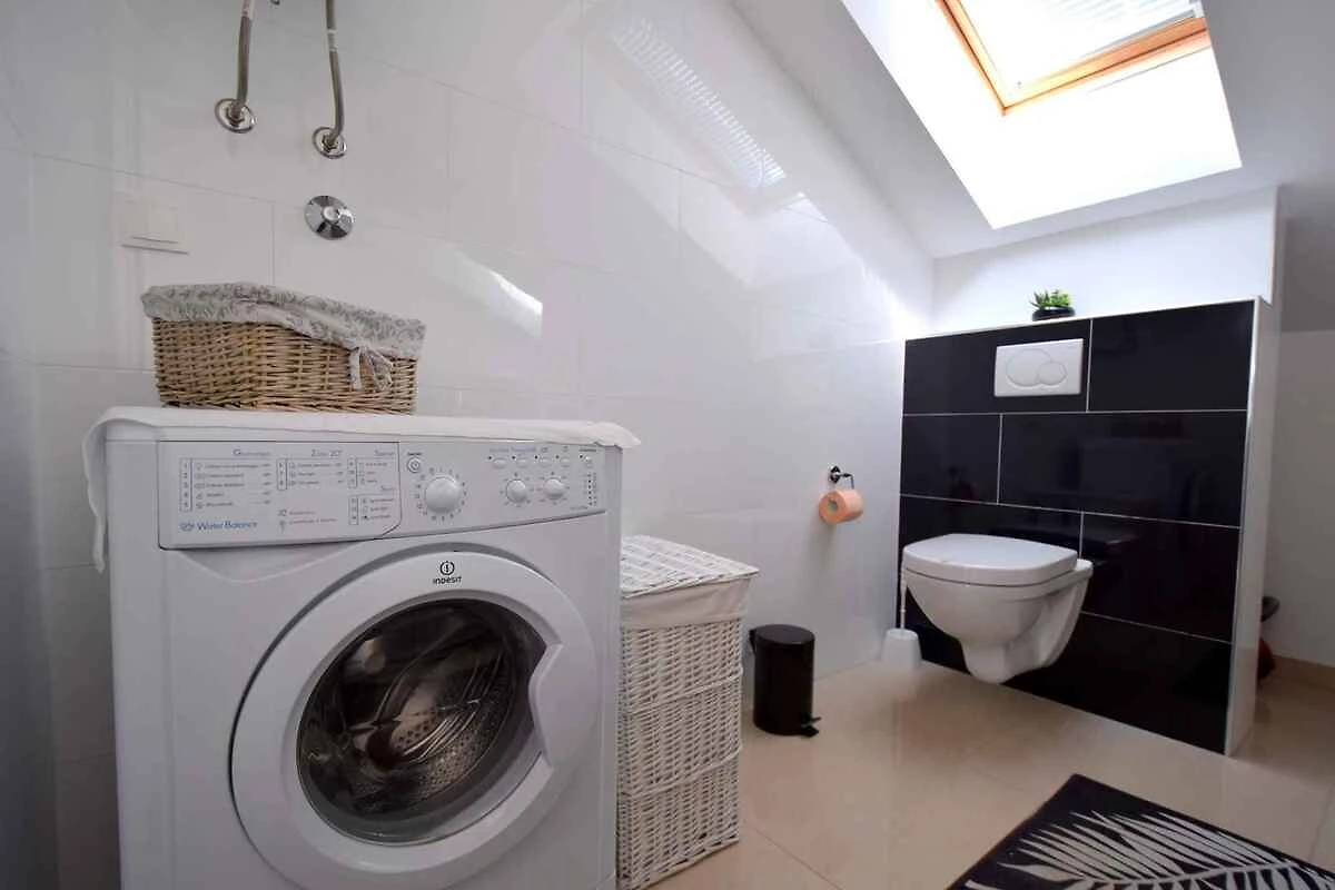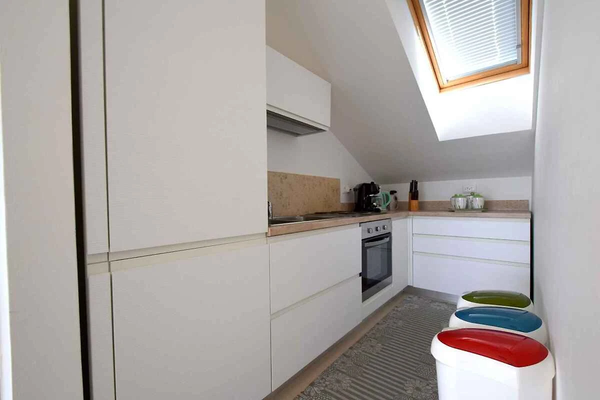 L'ingresso al vostro appartamento per le vacanze si trova al sottotetto e conduce tramite una scala interna direttamente nel corridoio. Soggiorno (15 mq, stanza di passaggio) con TV, zona pranzo e accesso al balcone accesso alla terrazza (15 mq). Camera da letto (12 mq) con 1 letto matrimoniale. Camera da letto (12 mq) con 1 letto matrimoniale e accesso al balcone accesso alla terrazza (6 mq). Cucina (8 mq, stanza di passaggio) con (piano cottura a induzione), frigorifero (scomparto freezer), macchina da caffè e bollitore elettrico. Bagno (10 mq) con lavatrice, 1 lavabo, WC, bidet e finestra.