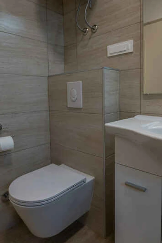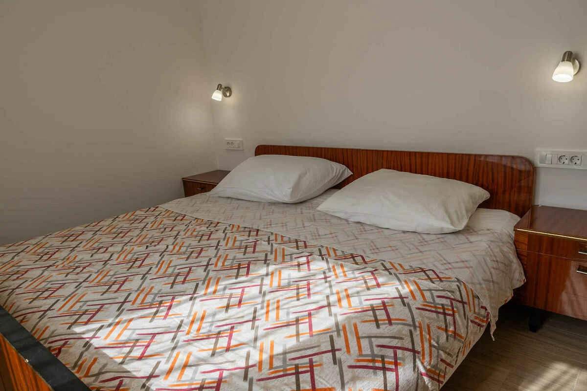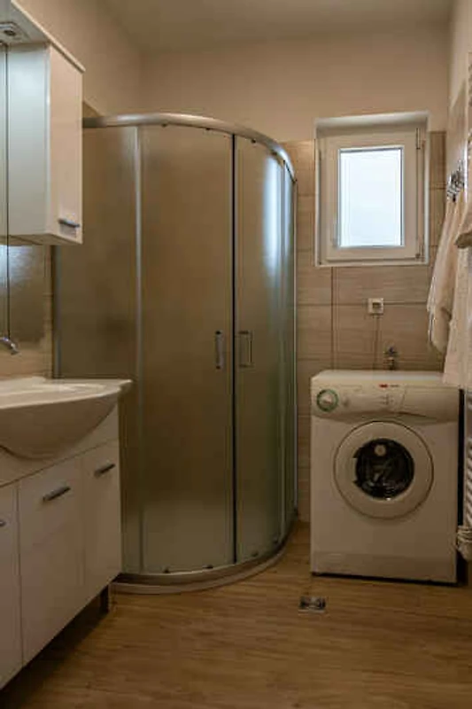 e conduce sopra una scala esterna direttamente nel corridoio con porte di tutte le camere. Sala da pranzo con TV, zona pranzo (5 posti) e accesso al balcone (mobili da giardino). Camera da letto (15 mq) con 1 letto matrimoniale e 1 letto aggiuntivo su divano/sofa. Camera da letto (15 mq) con 2 letti singoli. Angolo cucina (10 mq) con (2 fiamme), frigorifero e caffettiera. Bagno (9 mq) con doccia, 1 lavandino e WC.