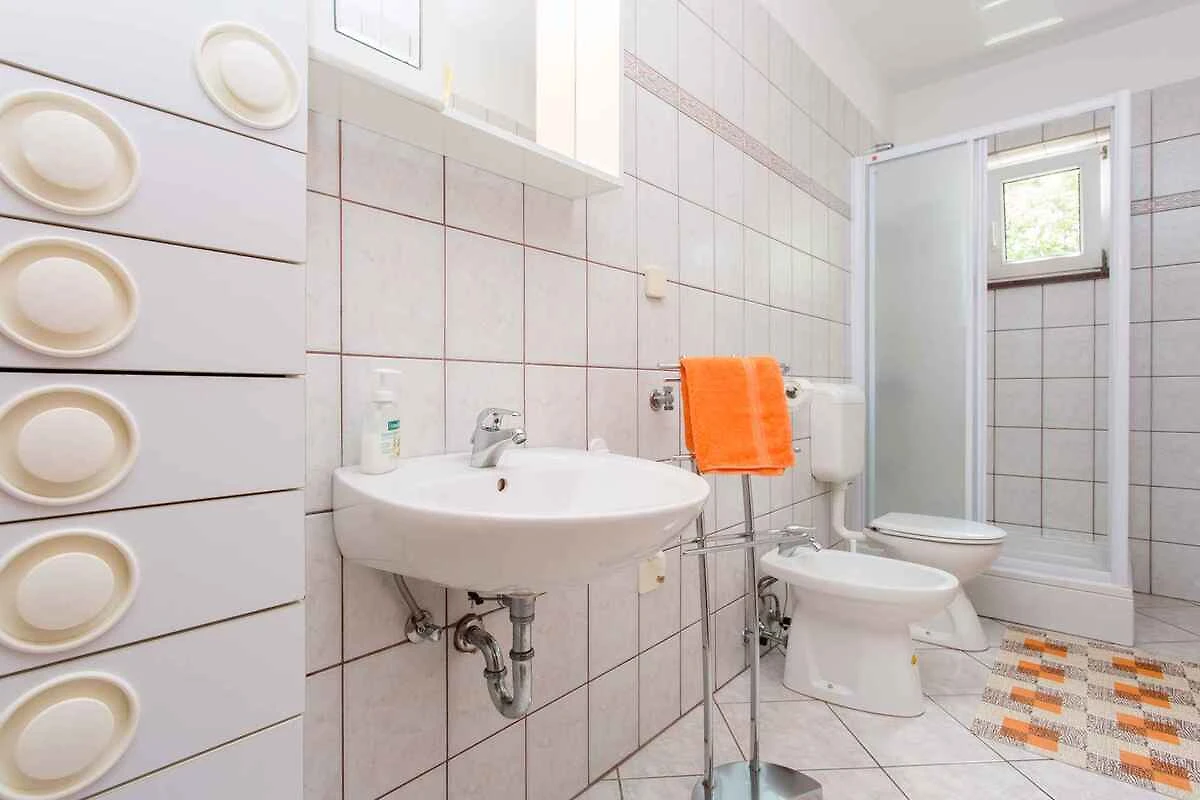 e conduce direttamente nel corridoio. Soggiorno con TV, zona pranzo, accesso alla terrazza (20 mq, coperto, mobili da giardino) e vista mare. Camera da letto con 1 letto matrimoniale e 1 letto singolo. Camera da letto con 2 letti singoli. Angolo cucina nella cucina soggiorno con stufa a gas (2 fiamme), fornello elettrico (2 fornelli), forno, cappa aspirante, frigorifero (scomparto del ghiaccio) e caffettiera. Bagno con doccia, 1 lavandino, WC, bidet e finestra.