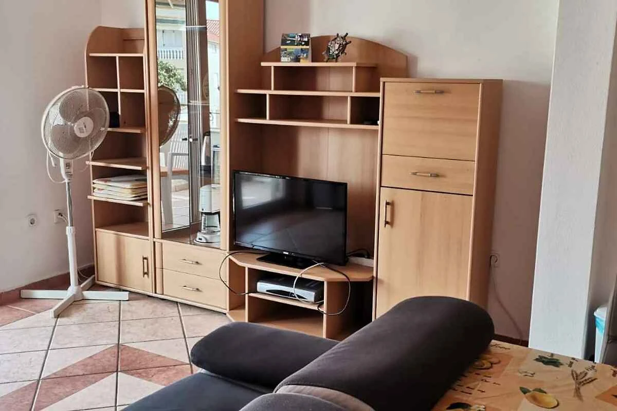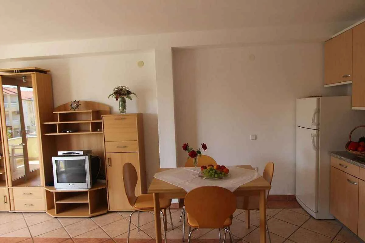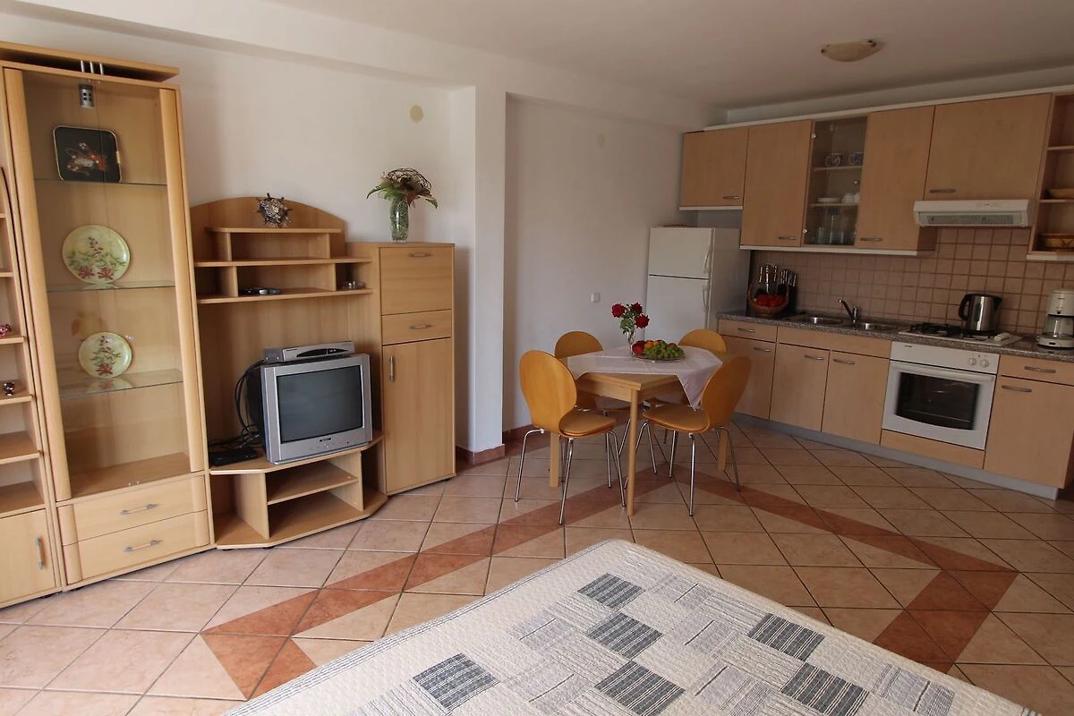 e conduce direttamente nel soggiorno/camera da letto. Soggiorno con 2 letti aggiuntivi su divano letto doppio, TV e accesso al balcone (4 mq). Camera da letto con 1 letto matrimoniale. La cucinetta nel soggiorno con stufa a gas (3 fiamme), fornello elettrico (1 fornello), forno, frigorifero (scomparto del ghiaccio), microonde e caffettiera. Bagno con lavatrice, doccia e WC.