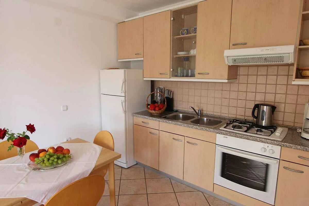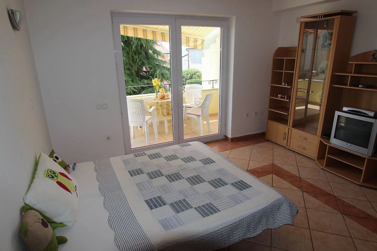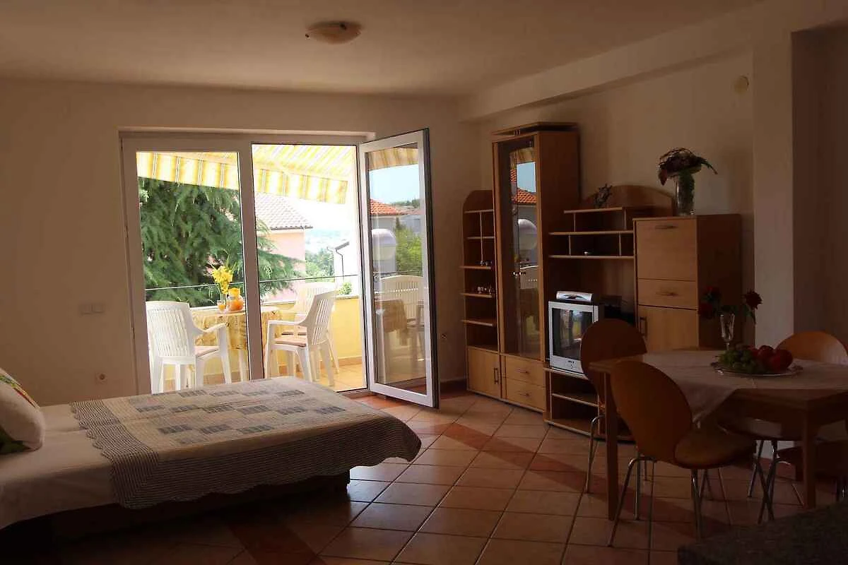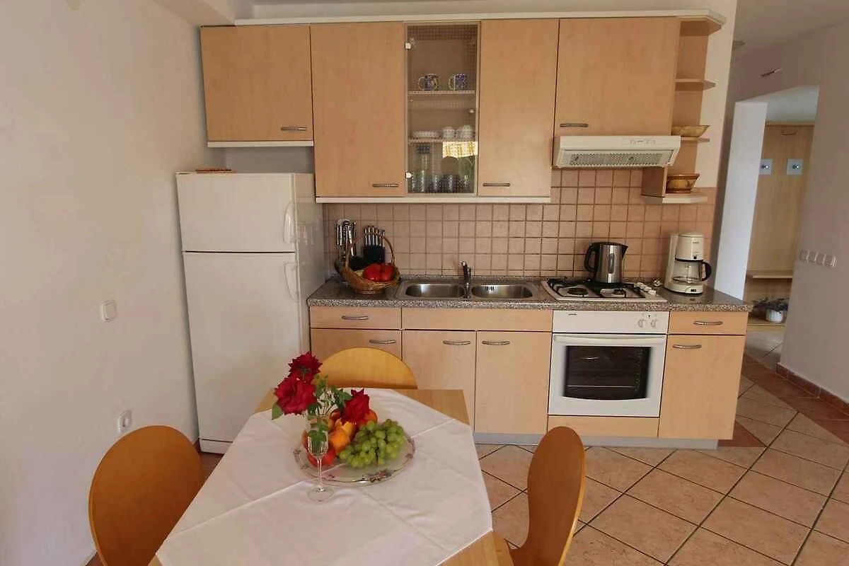 e conduce direttamente nel soggiorno/camera da letto. Soggiorno con 2 letti aggiuntivi su divano letto doppio, TV e accesso al balcone (4 mq). Camera da letto con 1 letto matrimoniale. La cucinetta nel soggiorno con stufa a gas (3 fiamme), fornello elettrico (1 fornello), forno, frigorifero (scomparto del ghiaccio), microonde e caffettiera. Bagno con lavatrice, doccia e WC.