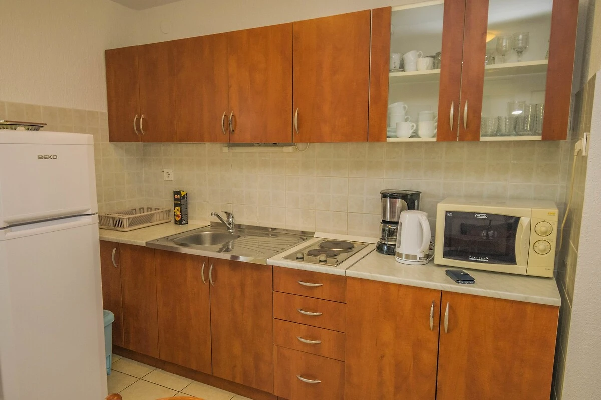 e conduce sopra una scala esterna. Soggiorno/camera da letto con angolo di seduta, TV, radio e accesso alla terrazza (20 mq, coperto, mobili da giardino). Camera da letto con 1 letto matrimoniale e 1 letto aggiuntivo su letto (più piccolo 2,00 x 0,90 m). Camera da letto con 1 letto matrimoniale. Angolo cucina nel soggiorno con fornello elettrico (2 fornelli), frigorifero (scomparto del ghiaccio), microonde, caffettiera e bollitore elettrico. Bagno con doccia, 1 lavandino, WC e bidet.