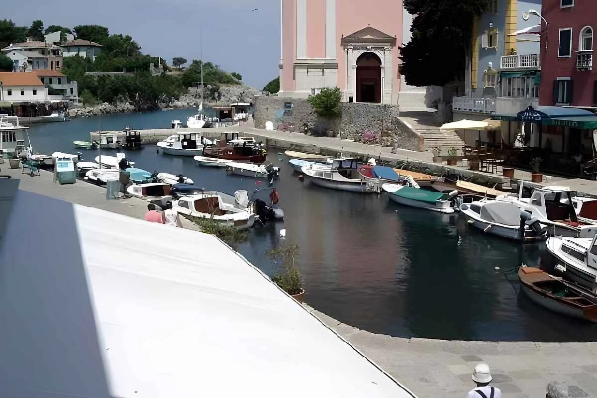 Veli Lošinj. L'appartamento per le vacanze si trova su un terreno aperto. Il locatore abita in un edificio separato sulla proprietà. Pogled na more i centar grada. L'accesso avviene tramite un sentiero (ghiaia o pietrisco). Parcheggio in un parcheggio nel paese. Parcheggio pubblico a 250 m.