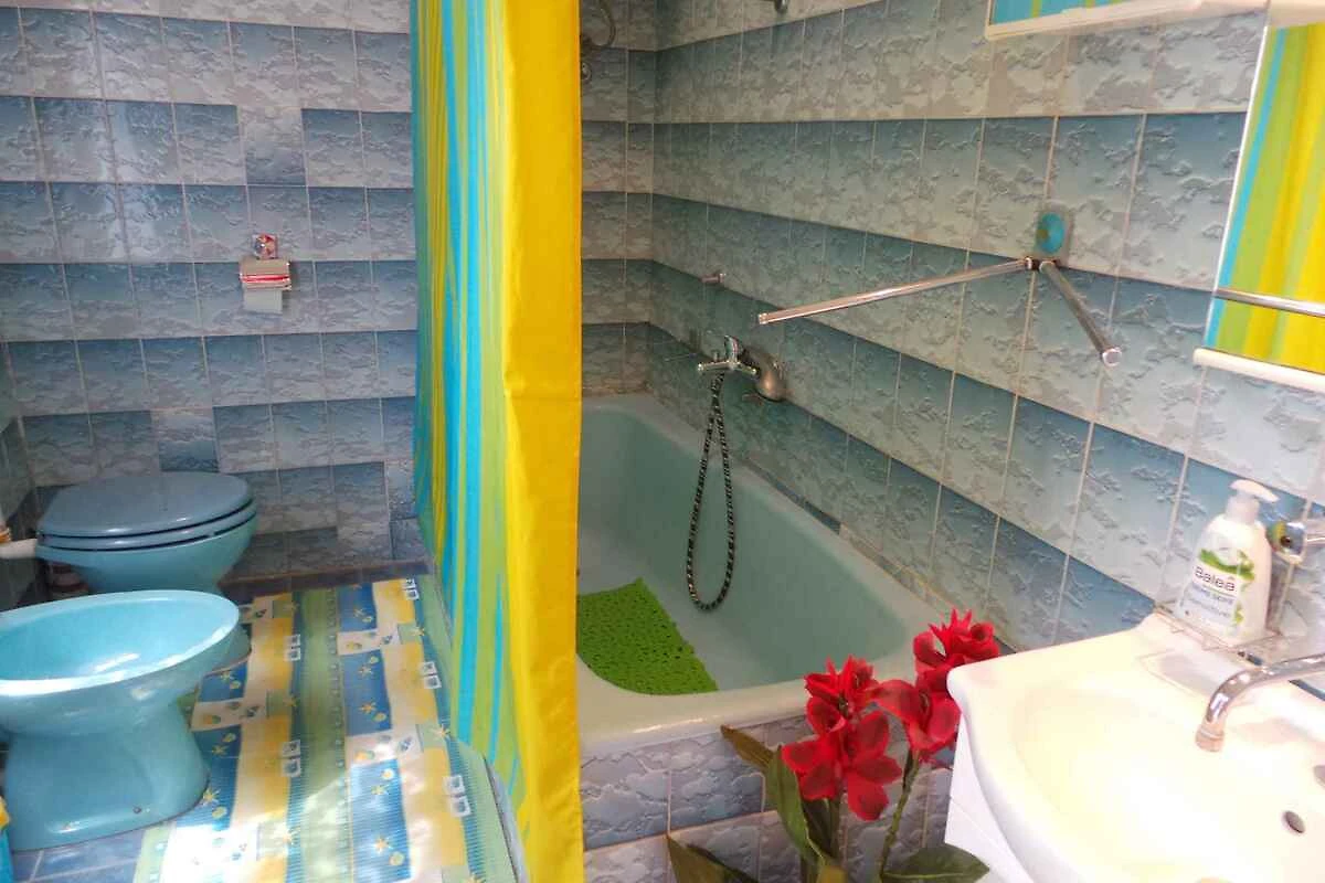 L'ingresso al vostro appartamento per le vacanze si trova al 1° piano e conduce direttamente nel corridoio con guardaroba. Camera da letto con 1 letto matrimoniale e TV. Camera da letto con 1 letto matrimoniale e 1 letto aggiuntivo. Cucina con angolo pranzo, fornello elettrico (2 piastre), forno, frigorifero (congelatore), microonde, macchina per il caffè, tostapane e accesso alla terrazza. Bagno con vasca, WC e bidet.