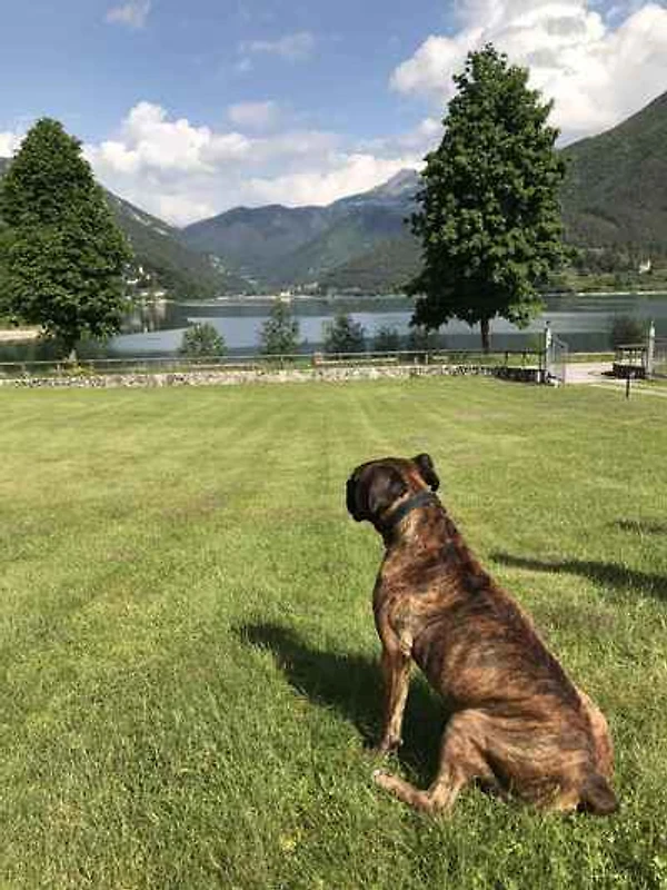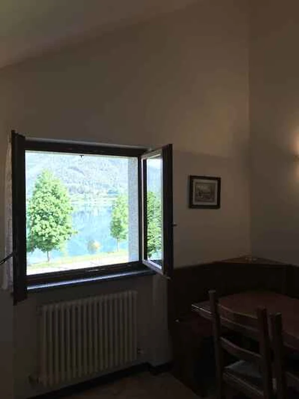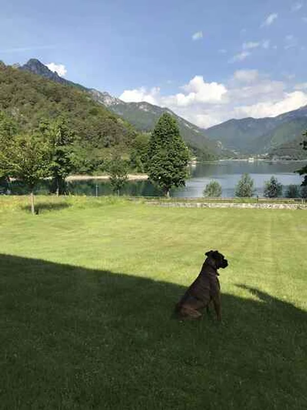Molina di Ledro. L' appartamento vacanze si trova in una trama del giardino aperta, grande 3000 mq con prato e alberi. Il proprietario non abita nella casa o nella proprietá. Vista dalla proprietà al Ledrosse. Parcheggio sulla proprietà.