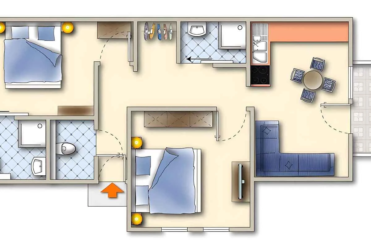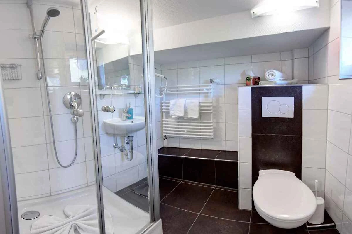 L'ingresso del vostro appartamento si trova nell'attico e conduce sopra una scala interna direttamente nel vestibolo con guardaroba. Tetto spiovente. Cucina soggiorno con angolo di seduta, TV, zona pranzo (4 posti), accesso al balcone (coperto, mobili da giardino, 1 tavolo, 3 sedie) e tetto spiovente. Camera da letto con 1 letto matrimoniale. Camera da letto con 1 letto matrimoniale e TV. Angolo cucina nella cucina soggiorno con zona pranzo (4 posti), fornello elettrico (piano cottura ceran, 2 fornelli), lavastoviglie, frigorifero (scomparto del ghiaccio), microonde, caffettiera, tostapane e bollitore elettrico. Bagno con doccia, 1 lavandino, WC, asciugacapelli e finestra. Bagno con doccia, 1 lavandino e asciugacapelli. WC separato con WC.