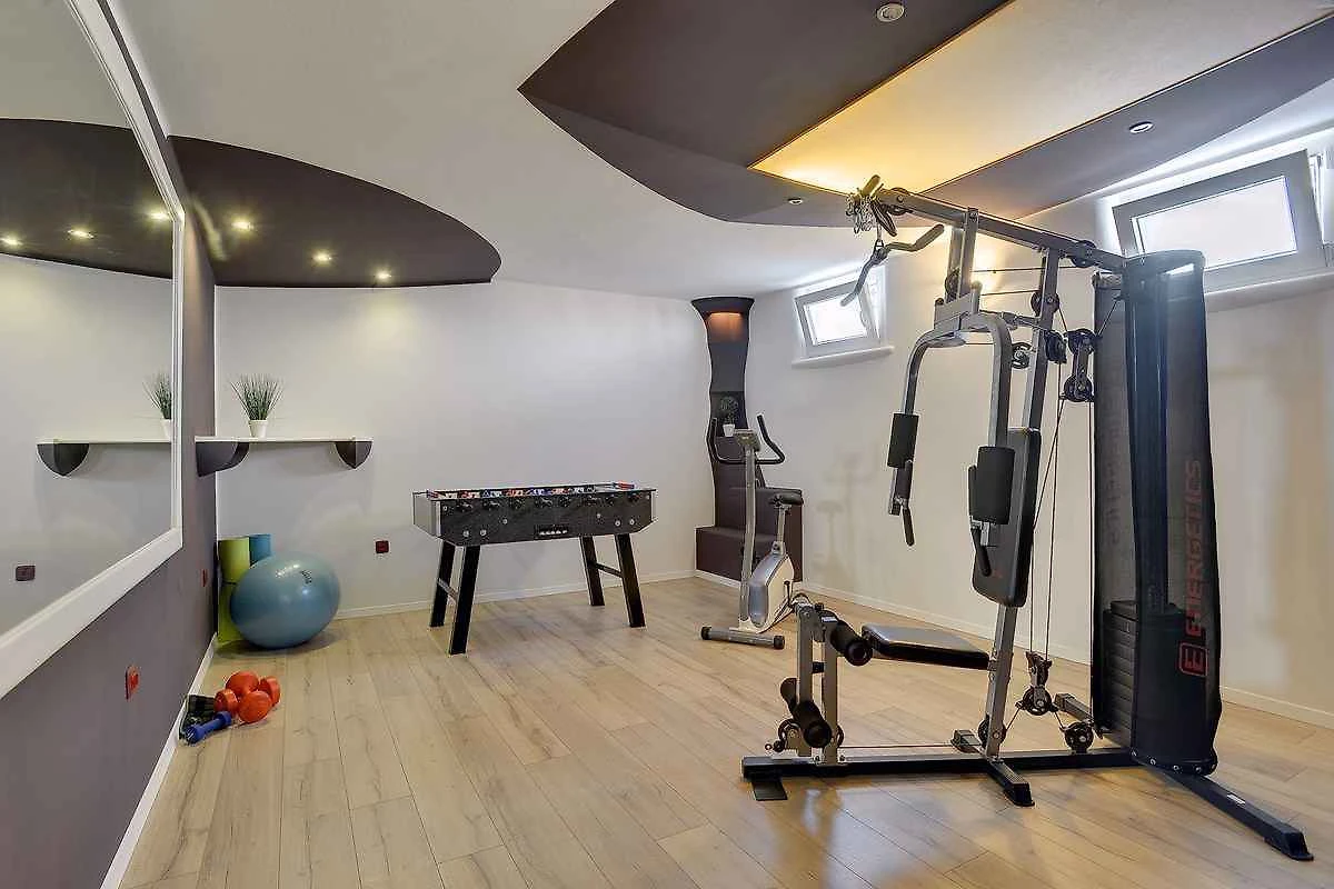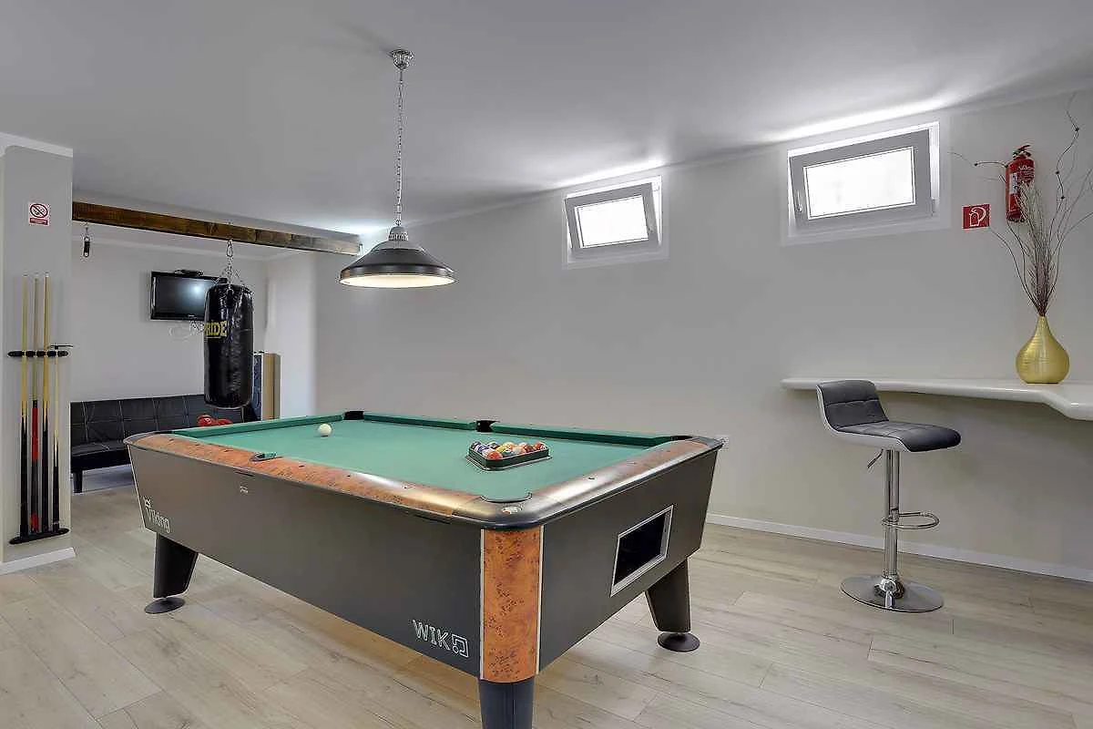 attrezzature per il fitness, ping-pong, calcio da tavolo, biliardo e freccette.