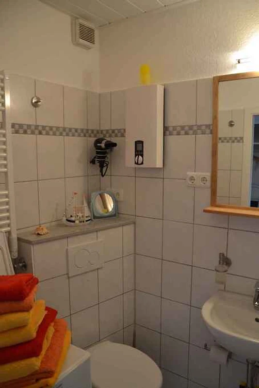 Wendtorf. Il proprietario non abita nella casa o nella proprietá. L'appartamento si trova dietro la diga a sud con una visione della natura. Parcheggio (per 2 auto) sulla strada davanti alla casa.