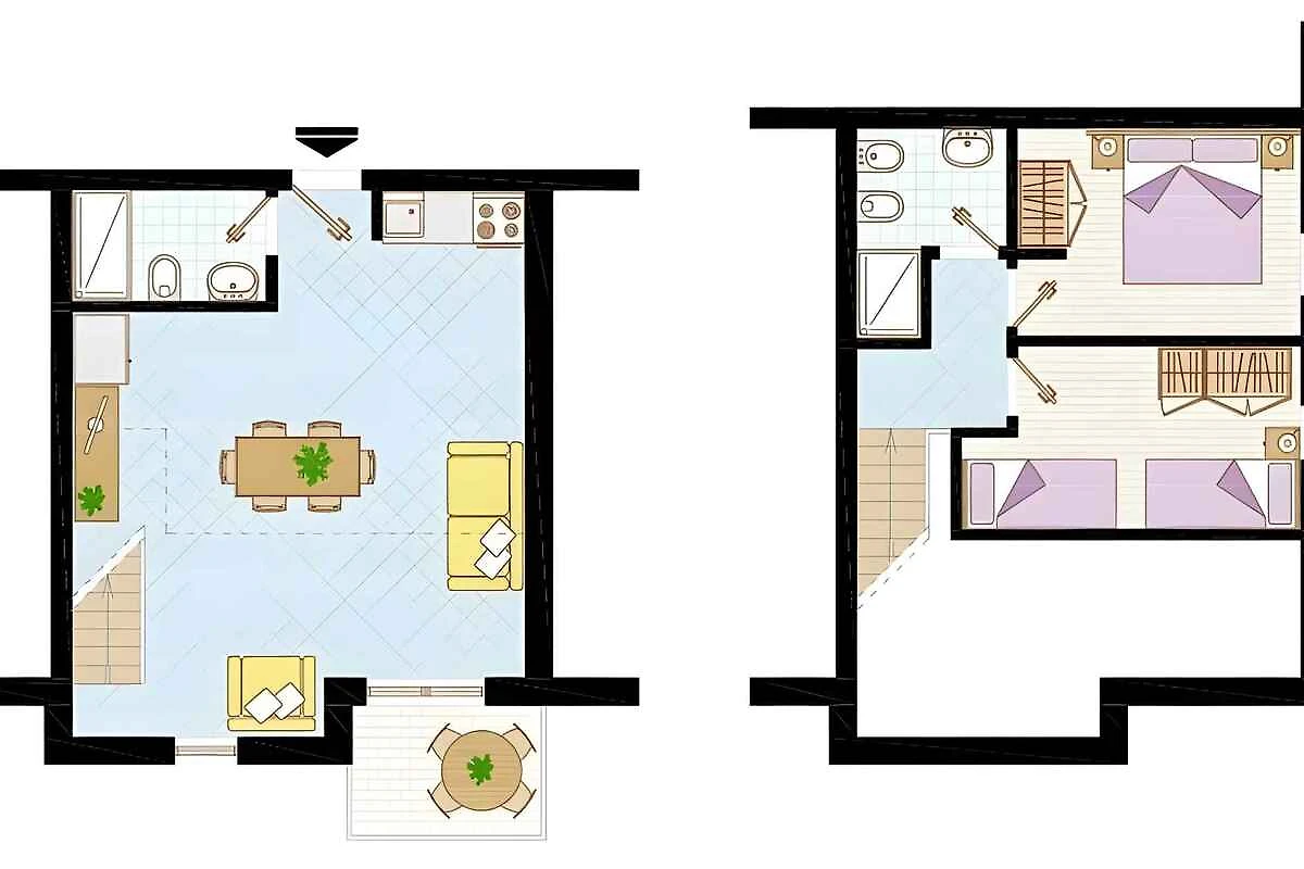 Appartamento vacanze, 2 piani, 3 stanze (di cui 2 camera da letto), 55 mq, totale 7 letti (di cui 3 letti aggiuntivi).