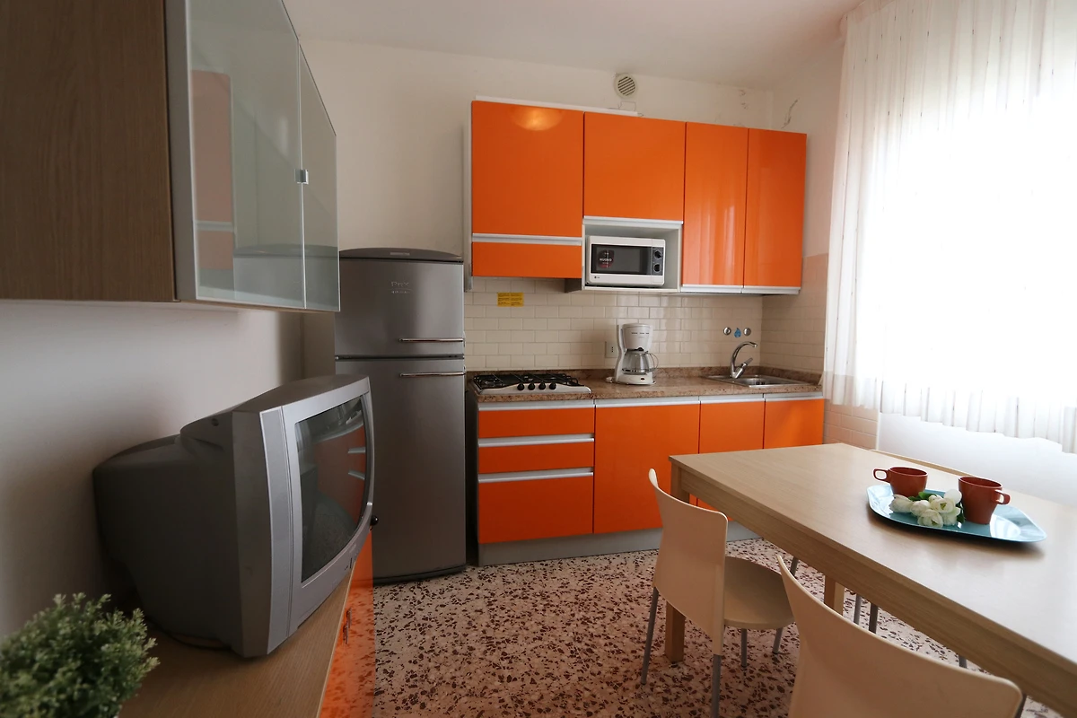 Soggiorno con TV e accesso al balcone. Camera da letto con 1 letto matrimoniale, 2 letti singoli, 1 culla e Culla per bambini su richiesta. La cucinetta nella cucina soggiorno con microonde e caffettiera. Bagno con doccia, 1 lavandino e WC.