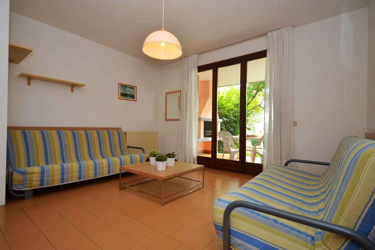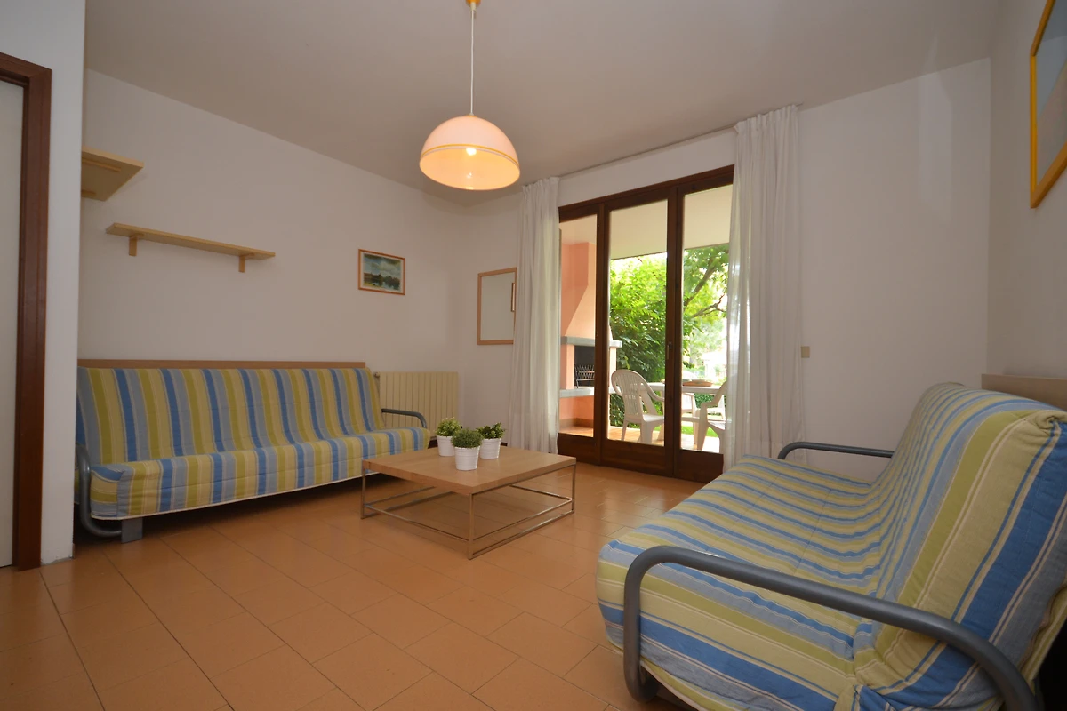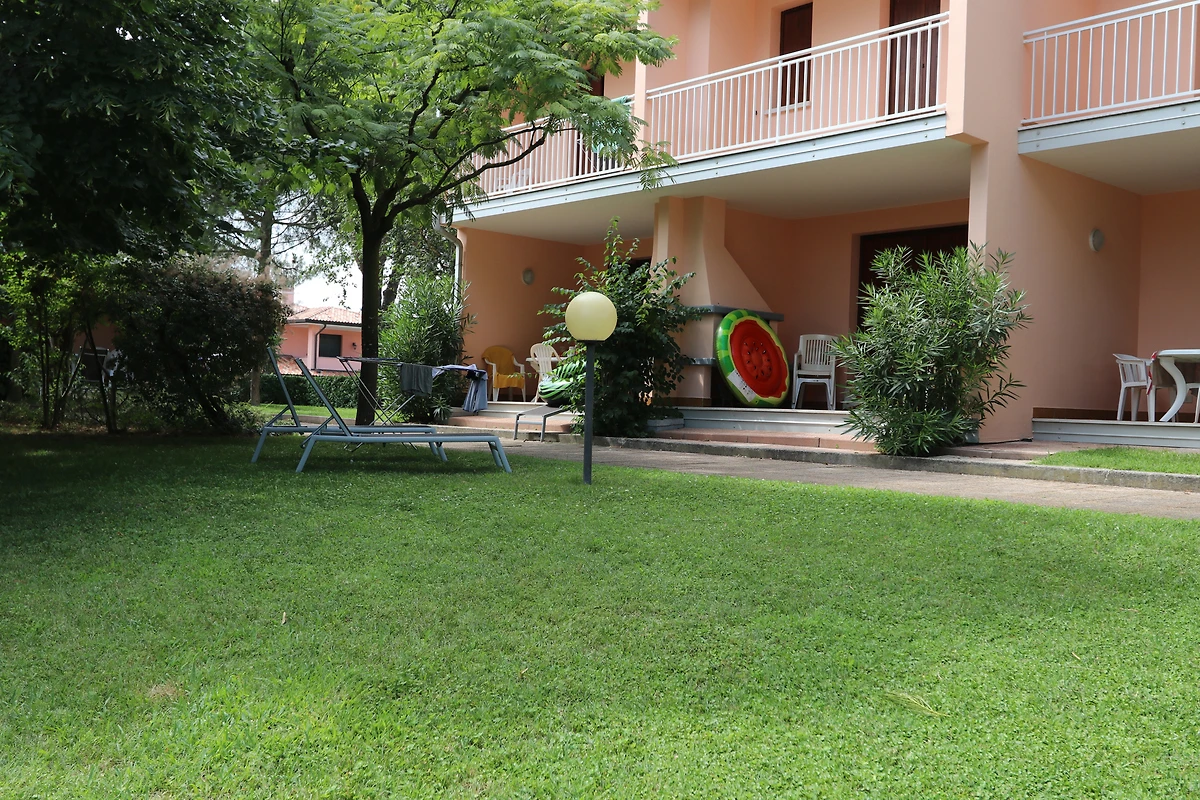Bibione, frazione Spiaggia. La casa vacanza si trova in un villaggio turistico, in una trama del giardino. Parcheggio in garage e sulla proprietà.