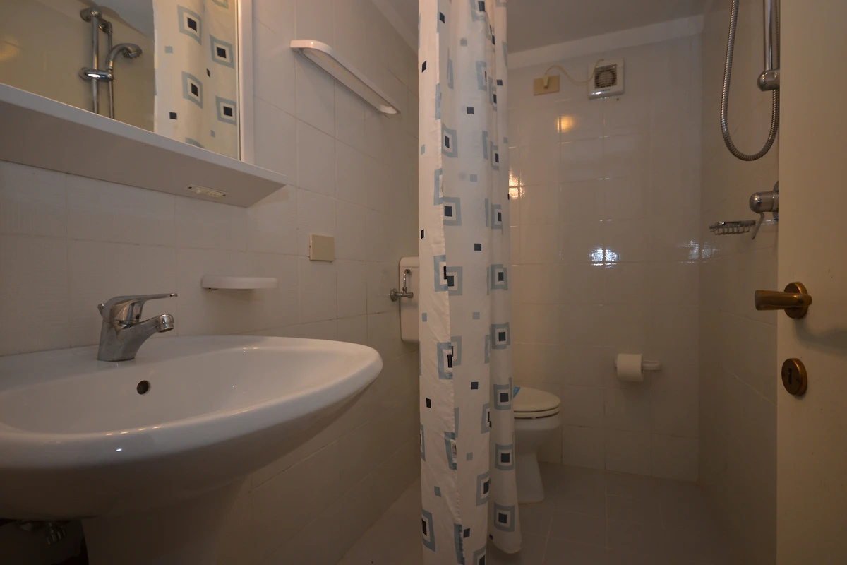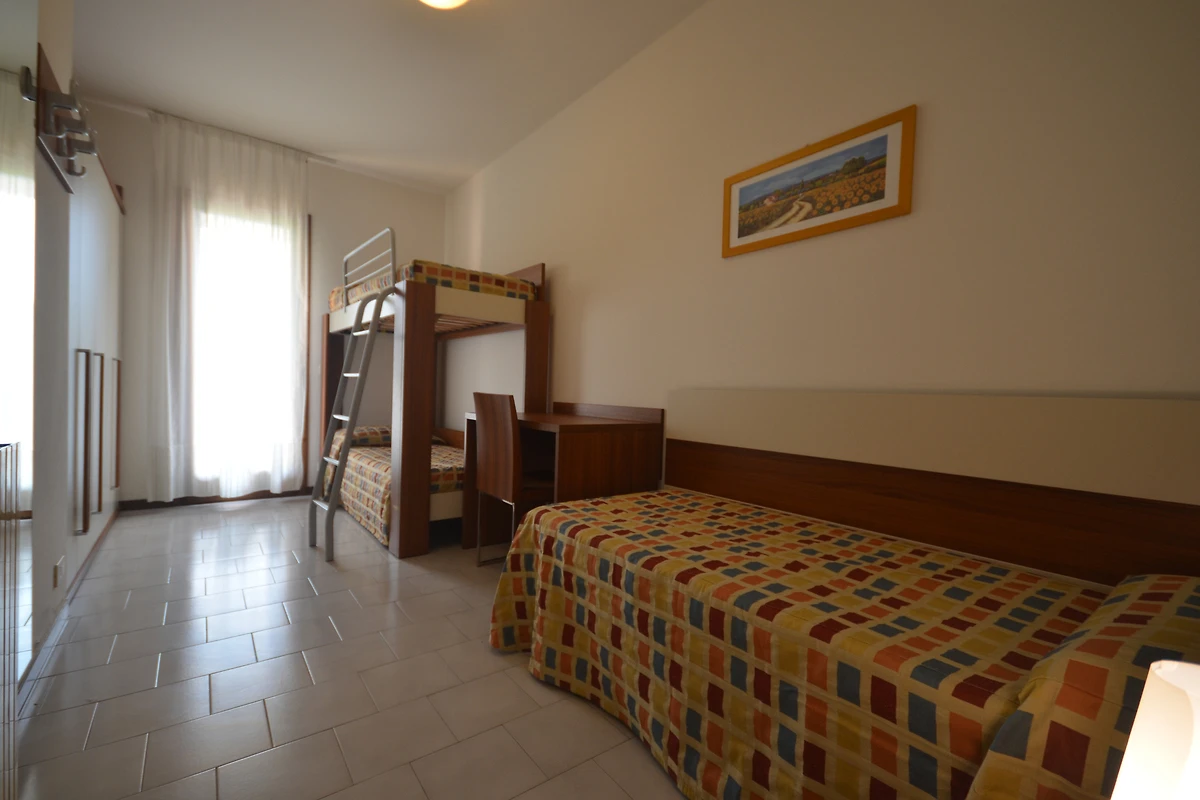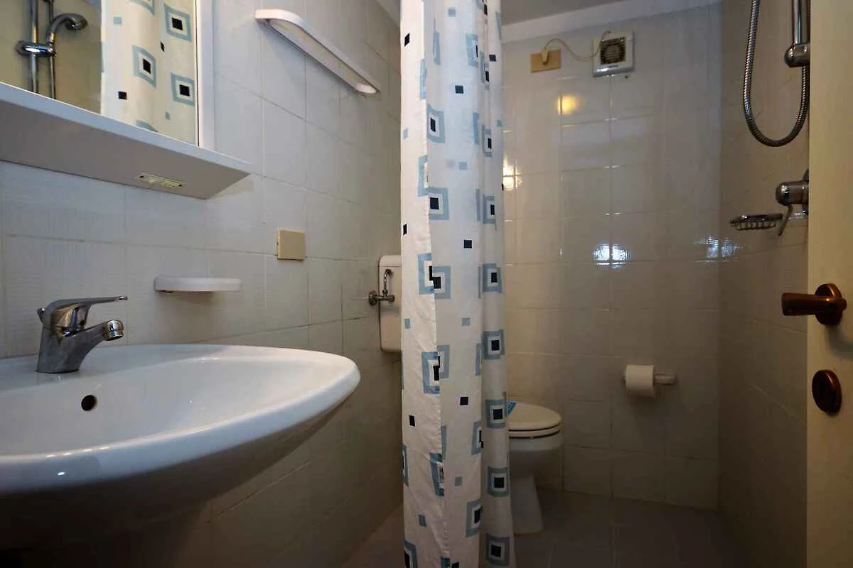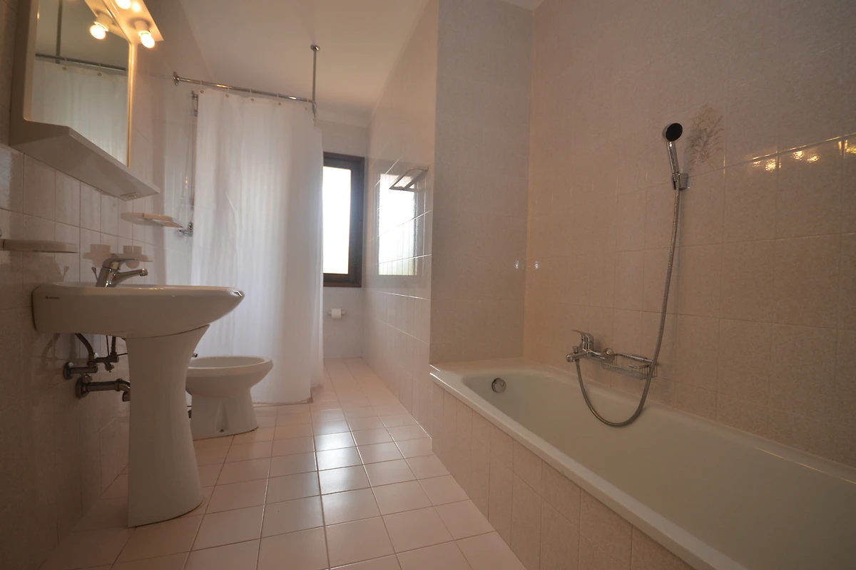 1° piano: Camera da letto con 3 letti singoli e accesso al balcone (coperto). Camera da letto con 1 letto singolo, 1 letto a castello e accesso al balcone (coperto). Bagno con vasca da bagno, doccia, 1 lavandino e WC.