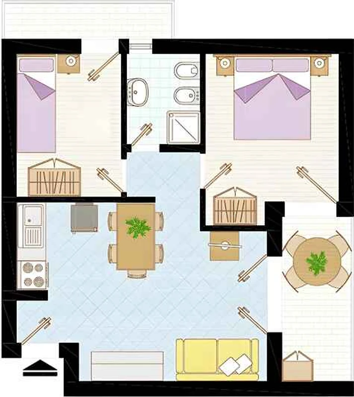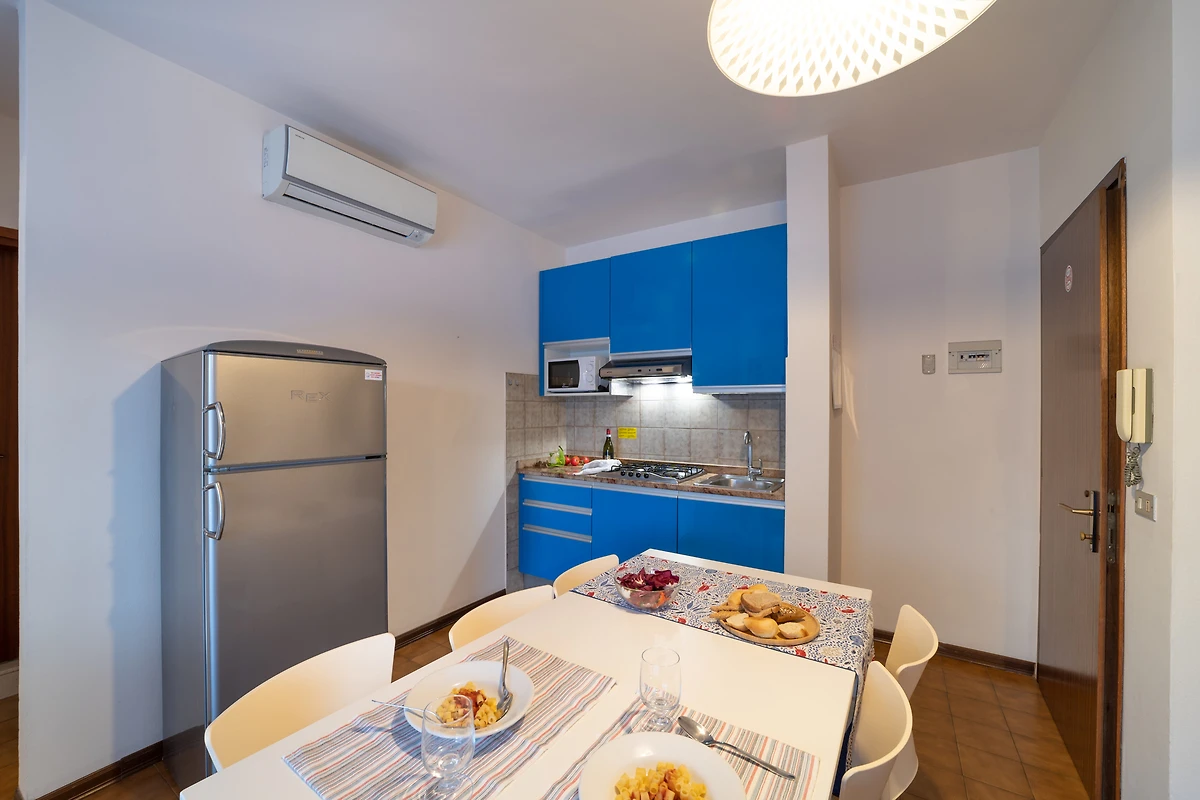 Appartamento vacanze, 1 piano, 3 stanze (di cui 2 camera da letto), 60 mq, totale 6 letti (di cui 2 letti aggiuntivi). Su richiesta: 1 bambino fino a 2 anni in culla.