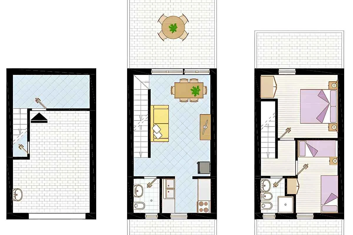 Piano terra: Soggiorno/camera da letto con 2 letti aggiuntivi su divano/sofa, TV e accesso alla terrazza. Cucina con microonde, caffettiera e accesso al balcone. Bagno con doccia, 1 lavandino e WC.