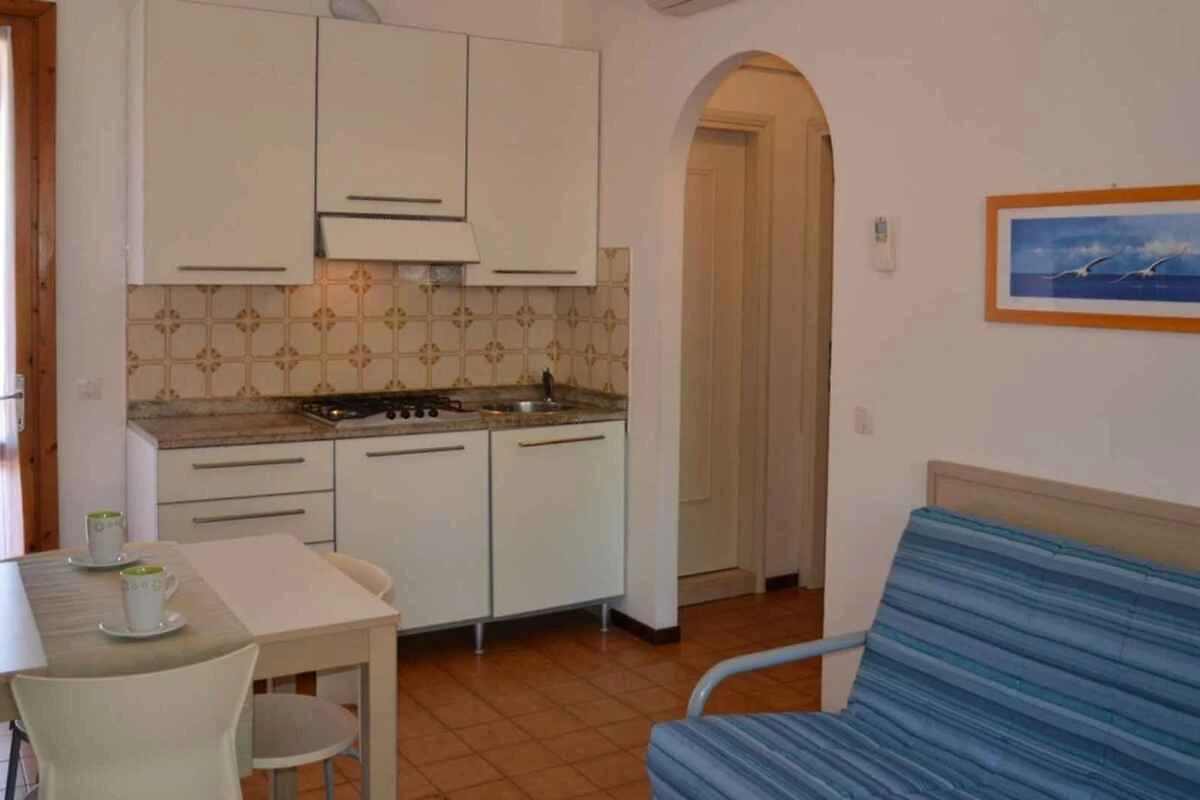 e conduce direttamente nel soggiorno/camera da letto. Soggiorno/camera da letto con 2 letti aggiuntivi su divano letto doppio, TV e accesso al balcone. Camera da letto con 2 letti singoli. Camera da letto con 1 letto matrimoniale, 1 culla e Lettino per bambini su richiesta. Angolo cucina in soggiorno/camera da letto con stufa a gas, frigorifero, microonde e caffettiera. Bagno con doccia, 1 lavandino e WC.