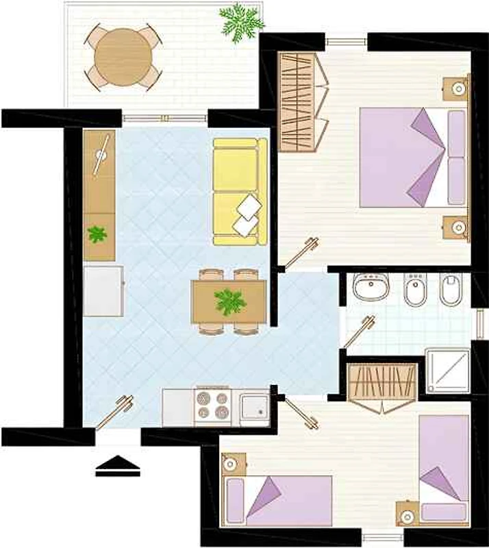 Appartamento vacanze, 1 piano, 3 stanze (di cui 2 camera da letto), 45 mq, totale 6 letti (di cui 2 letti aggiuntivi). Su richiesta: 1 bambino fino a 2 anni in culla.