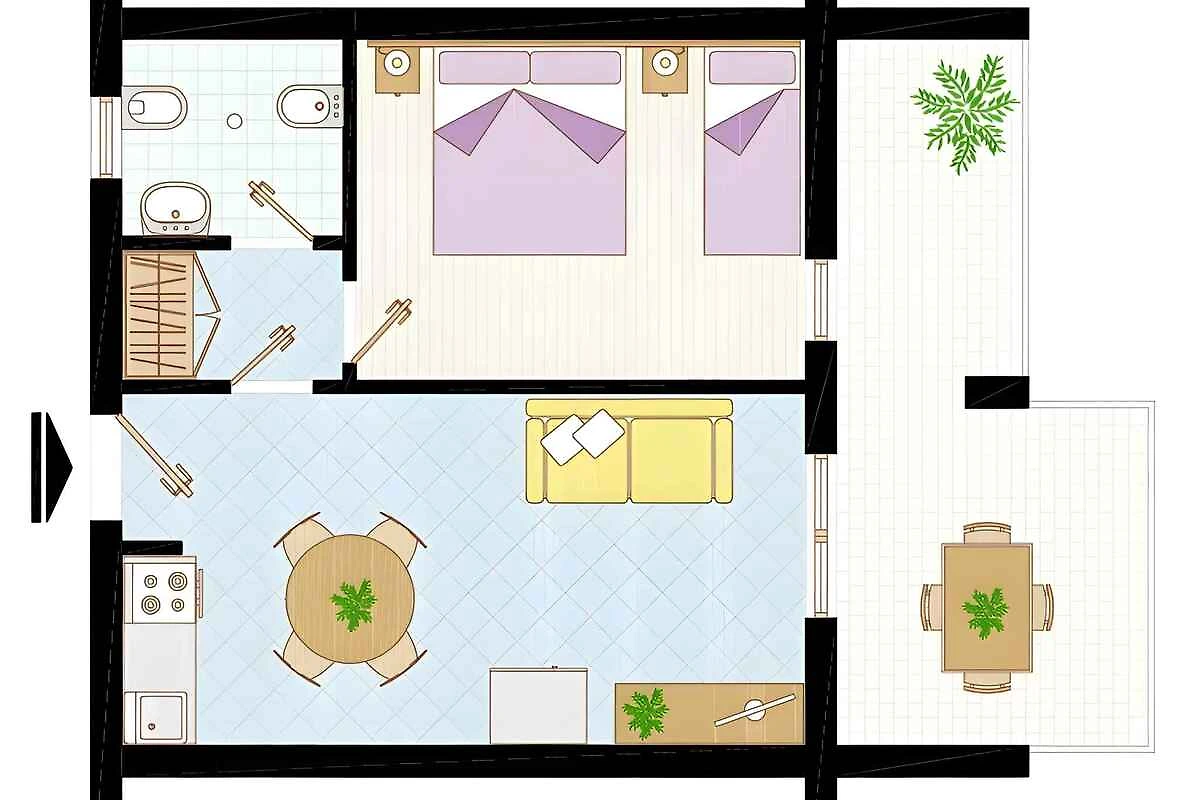 L'ingresso del vostro appartamento conduce direttamente nel soggiorno/camera da letto. Soggiorno/camera da letto con 2 letti aggiuntivi su divano letto doppio, TV e accesso al balcone. Camera da letto con 3 letti singoli, 1 culla e Lettino per bambini su richiesta. Angolo cucina in soggiorno/camera da letto con stufa a gas, frigorifero, microonde e caffettiera. Bagno con doccia, 1 lavandino e WC.