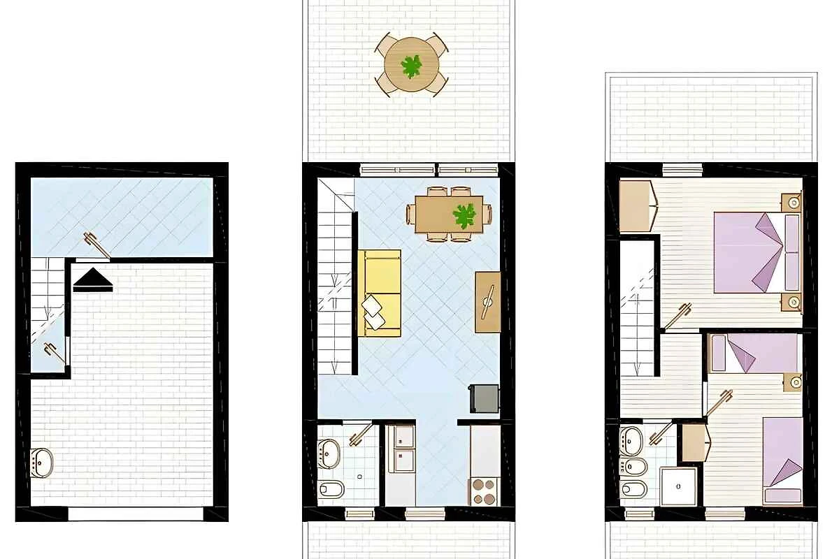 Piano terra: Soggiorno/camera da letto con 2 letti aggiuntivi su divano/sofa, TV e accesso alla terrazza. La cucinetta in soggiorno/camera da letto con microonde, caffettiera e accesso al balcone. Bagno con doccia, 1 lavandino e WC.