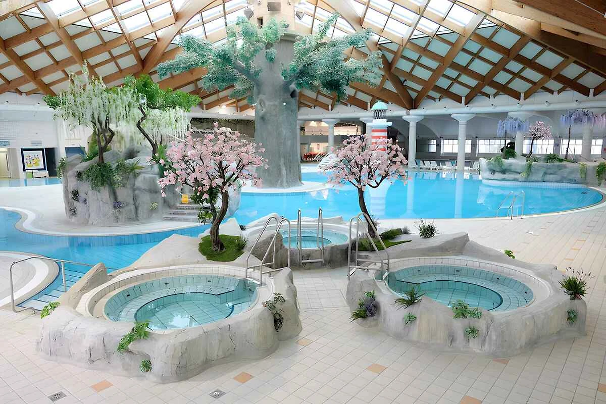 Piscina esterna. Piscina per bambini. Piscina interna. Il villaggio offre due parchi termali separati per garantire il divertimento tutto l'anno. La Riviera Termale estiva copre un'area di 10.000 metri quadrati di acqua termale e offre una varietà di piscine di diverse forme e dimensioni, adatte sia agli adulti che ai bambini. Le attrazioni principali includono scivoli d'acqua, un'isola dei pirati, un canale di corrente, piscine a onde e vasche idromassaggio, perfette per rilassarsi al sole. La Riviera Termale Invernale, con i suoi 2.300 m² di acqua termale riscaldata, è ideale per vacanze benessere tutto l'anno e offre piscine interne ed esterne, scivoli d'acqua e altre attrazioni per grandi e piccini.