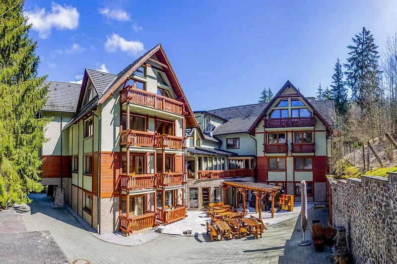Categoria del paese 3 stelle, 50 alloggi, 200 letti, ricezione (servizio 24 ore su 24), 1 ristorante, bar, cafè, sala comune con giocattoli per bambini, sala TV e sala da sci.