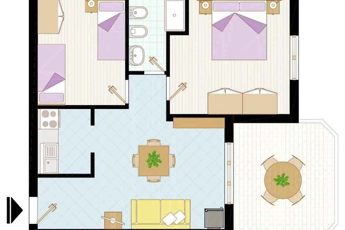 Appartamento vacanze, 1 piano, 3 stanze (di cui 2 camera da letto), 55 mq, totale 5 letti (di cui 1 letto aggiuntivo).