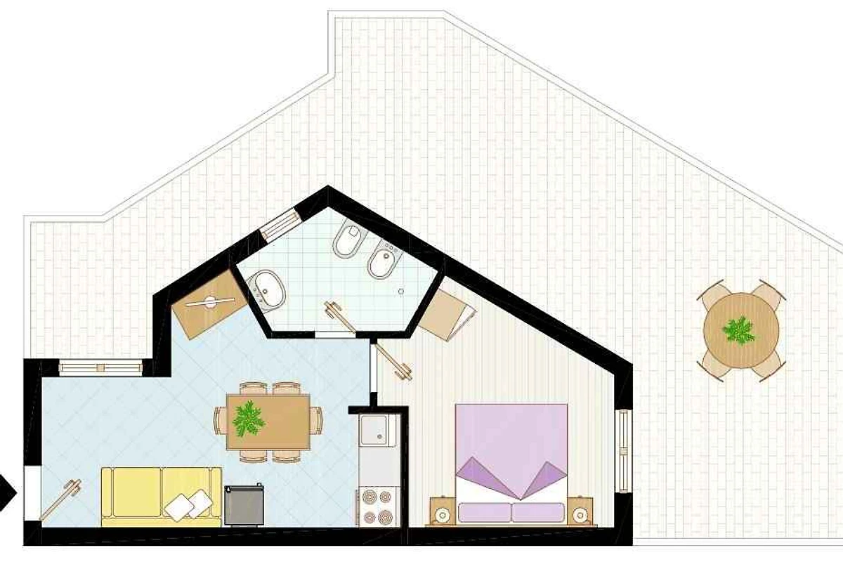 L'ingresso del vostro appartamento conduce sopra una scala interna direttamente nel soggiorno. Soggiorno/camera da letto con 2 letti aggiuntivi su divano letto doppio, TV e accesso al balcone. Camera da letto con 1 letto matrimoniale, 1 culla e Lettino per bambini su richiesta. La cucinetta in soggiorno/camera da letto con stufa a gas, frigorifero, microonde e caffettiera. Bagno con doccia, 1 lavandino e WC.